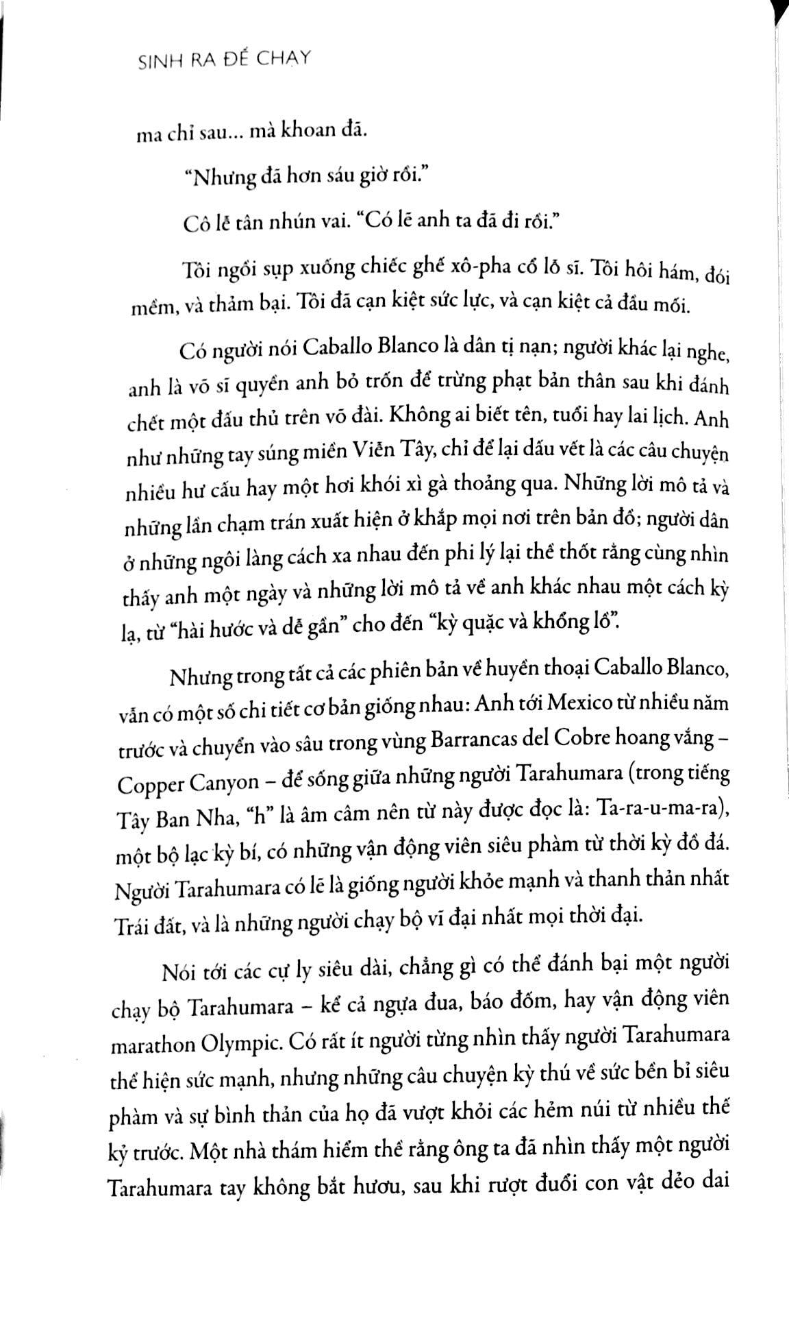 Sống ngăn cách với thế giới qua hẻm núi Copper Canyon (Mexico), người thổ dân Tarahumara đã tôi rèn khả năng chạy bộ hàng trăm dặm không ngơi nghỉ mà không gặp chấn thương nào. Nhà báo kỳ cựu đồng thời cũng là người chạy bộ hay mắc chấn thương Christopher McDougall đã lên đường tìm bí mật của họ. Dọc hành trình, anh đưa người đọc từ phòng thí nghiệm ở Đại học Harvard xuống thung lũng nóng như nung, lên những đỉnh cao buốt giá xuyên miền Bắc Mỹ, quê hương của người chạy bộ siêu phàm đẩy cơ thể đến cực hạn và cuối cùng là cuộc so tài thế kỷ trong hẻm núi Copper Canyon giữa những vận động viên chạy bộ cự phách nhất nước Mỹ và tộc người chạy bộ. Câu chuyện khó tin của McDougall không chỉ cuốn hút trí não mà còn tiếp sinh lực cho cơ thể khi bạn nhận ra từ thẳm sâu bên trong, m.ình được SINH RA ĐỂ CHẠY.