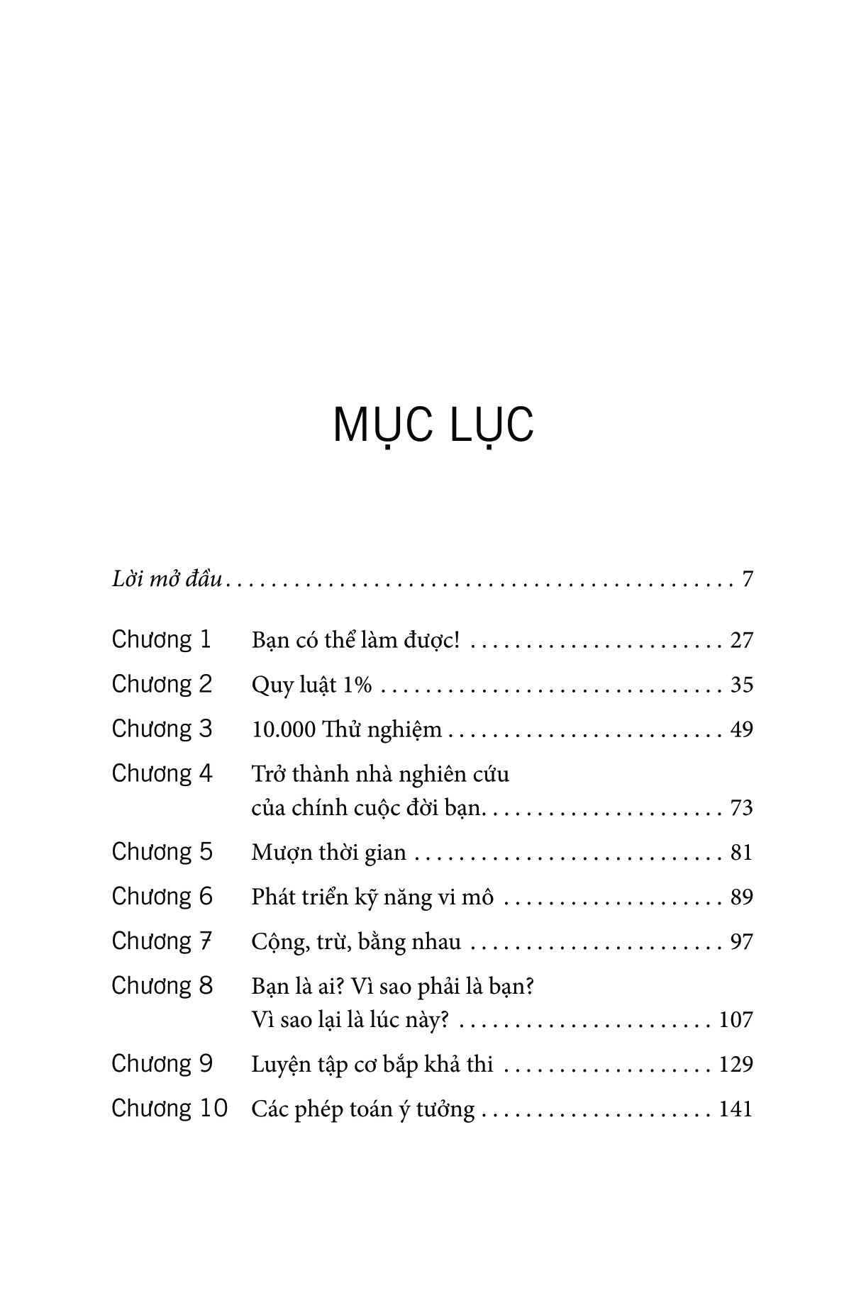 Khi bạn sử dụng Quy tắc 1% và các công cụ trong cuốn sách này (ví dụ như Quy tắc tăng hiệu suất 50/1, các kỹ thuật về phép toán ý tưởng và kiểm soát tình thế), bạn sẽ nhận ra rằng bạn có lượng thời gian gần như vô hạn để làm nên những tiến bộ 1% mỗi ngày trong cuộc sống của mình.