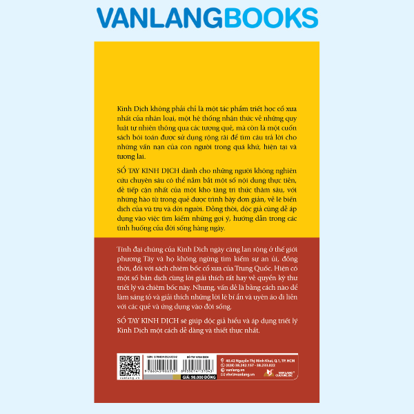 Sổ tay Kinh Dịch dành cho những người không nghiên cứu chuyên sâu có thể nắm bắt một số nội dung thực tiễn, dễ tiếp cận nhất của một kho tàng tri thức thâm sâu, với những hào từ trong quẻ được trình bày đơn giản, về lẽ biến dịch của vũ trụ và đời người. Đồng thời, độc giả cũng dễ áp dụng vào việc tìm kiếm những gợi ý, hướng dẫn trong các tình huống của đời sống hàng ngày."