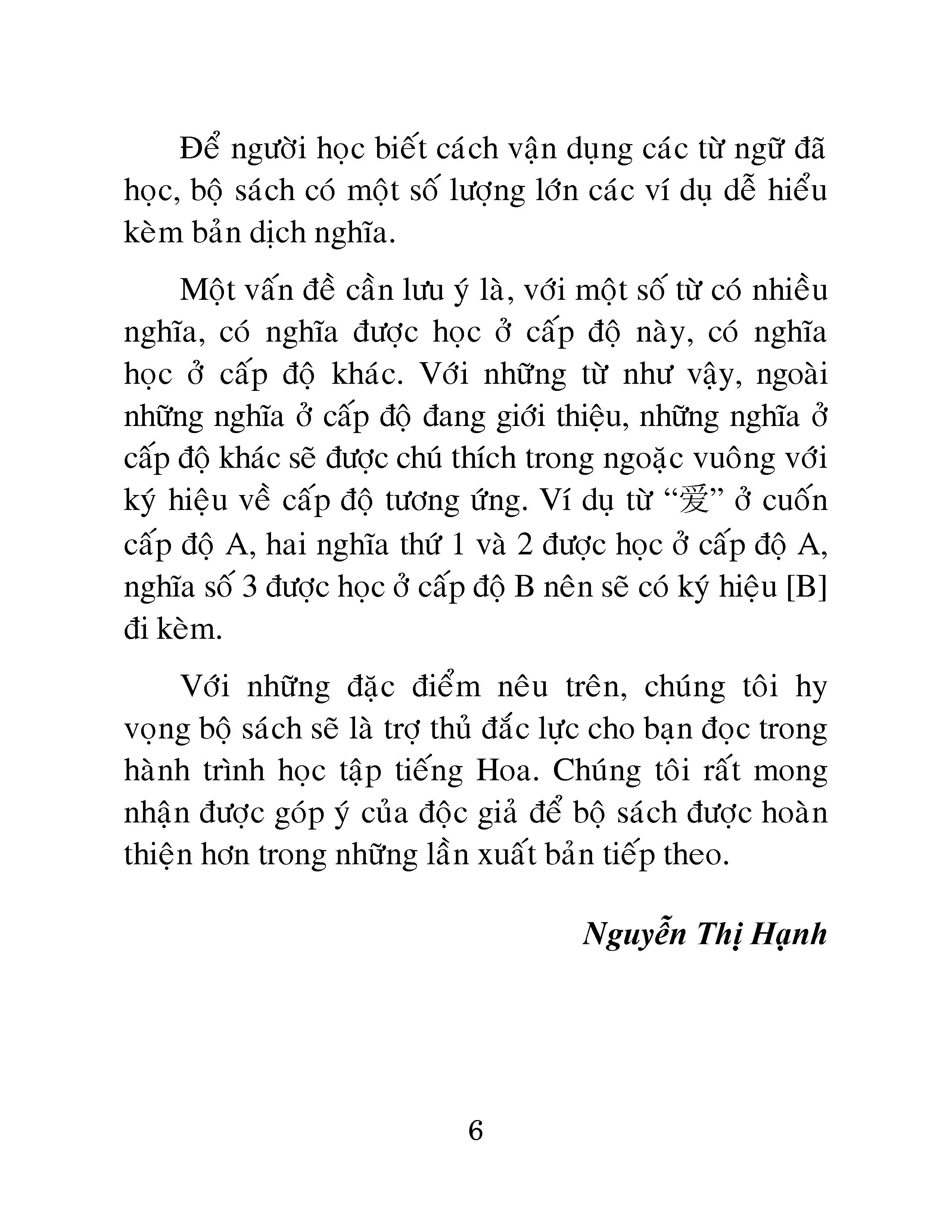 Với những đặc điểm nêu trên, chúng tôi hy vọng bộ sách sẽ là trợ thủ đắc lực cho bạn đọc trong hành trình học tập tiếng Hoa. Chúng tôi rất mong nhận được góp ý của độc giả để bộ sách được hoàn thiện hơn trong những lần xuất bản tiếp theo.