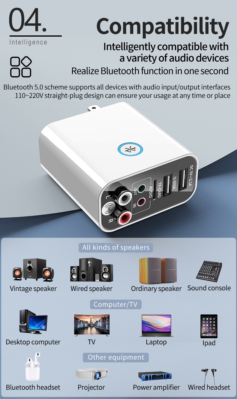 Tính năng: Dễ dàng sử dụng, bạn có thể nâng cấp các thiết bị âm thanh không BT chức năng BT thiết bị. BT 5.0 công nghệ, tiêu thụ điện năng thấp hơn, ổn định