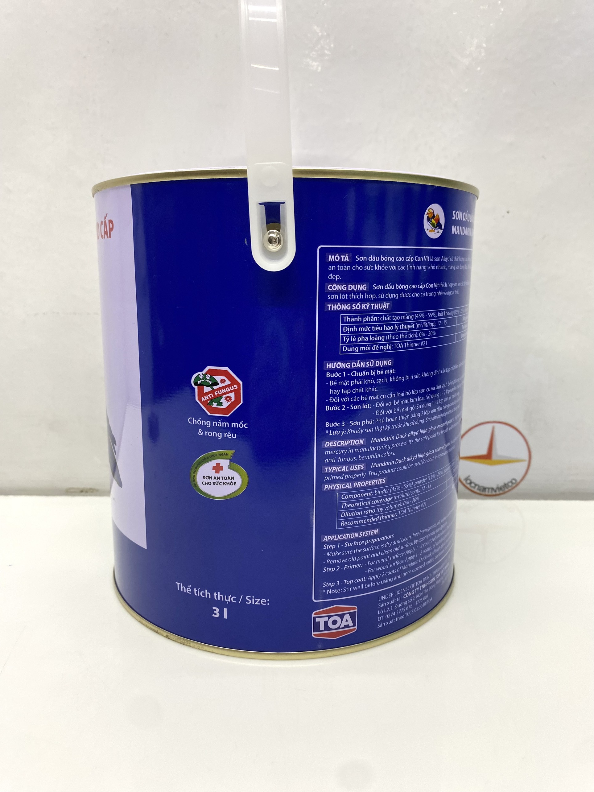 Mua tại TiktokSơn dầu cao cấp Toa hiệu Con Vịt màu xám MD191_3L Sơn dầu bóng cao cấp Con Vịt (Mandarin Duck) là loại sơn Alkyd chất lượng cao, không sử dụng Chì & Chất gây hại, là loại sơn an toàn cho sức khoẻ với các tính năng: Khô nhanh, màng sơn bóng đẹp, độ phủ cao, chống nấm mốc, màu sắc tươi đẹp.