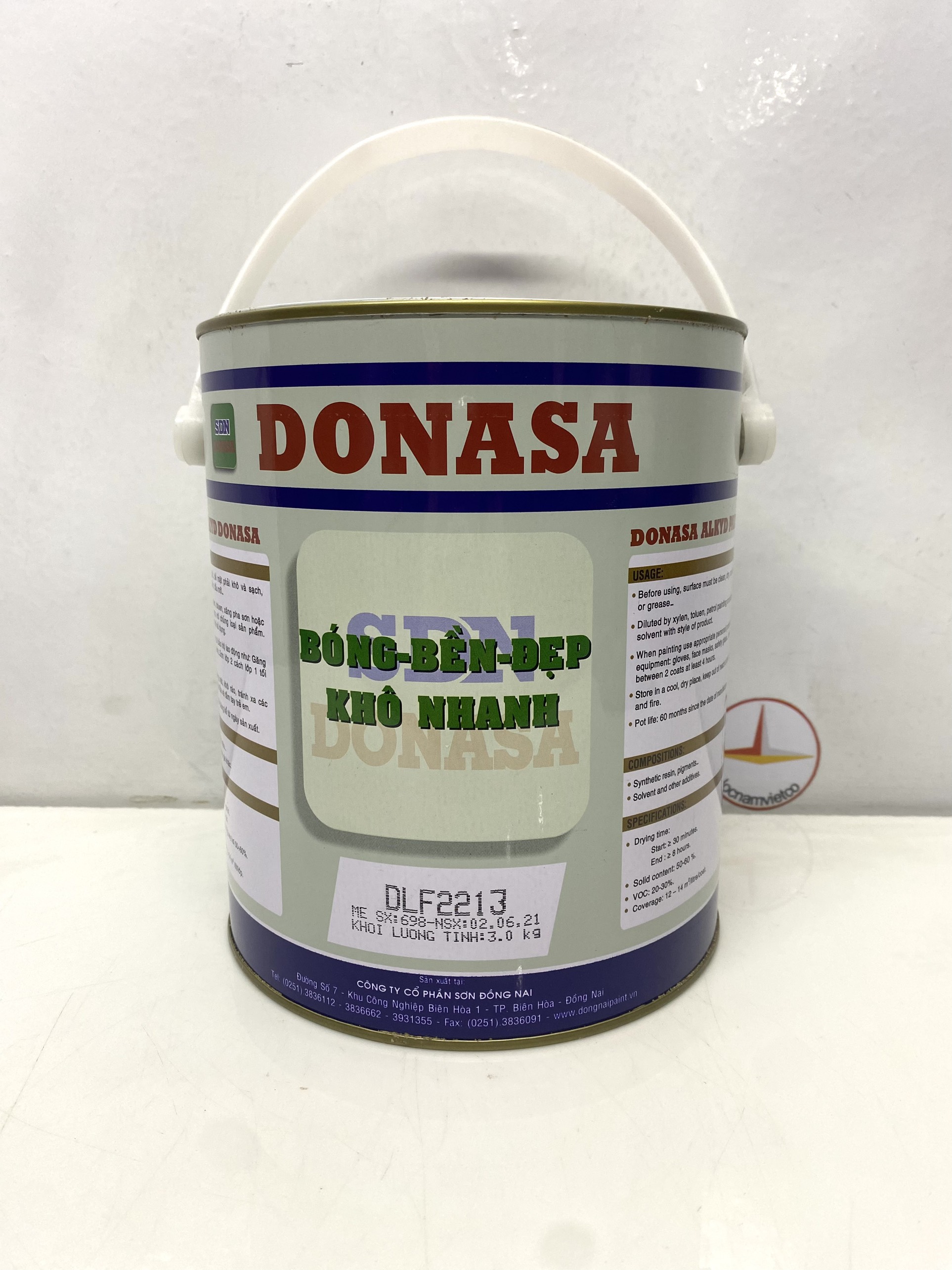 Sơn dầu Đồng Nai Donasa màu cam 2196 3kg  - Sơn Donasa Alkyd là loại Sơn phủ ngoài, trang trí cho các bề mặt gỗ và kim loại.   - Phù hợp các công trình xây dựng dân dựng,dùng sơn nội và ngoại thất.  Đặc điểm:  Sơn Đồng Nai  Alkyd Bám dính tốt trên bề mặt gỗ và kim loại. -   Bền màu, chịu phấn hóa. -   Bề mặt mịn, láng và giữ bóng. -   Không chứa chì,chrome và dẫn xuất của chúng. -   Dễ sử dụng khi thi công. Mã sản phẩm: DLF 1xxx: Đen - DLF 2xxx: Đỏ - DLF 3xxx: Ghi - DLF 4xxx: Tím DLF 5xxx: Trắng pha - DLF 6xxx: Vàng tone nghệ - DLF 7xxx: Vàng tone đất - DLF 8xxx: Xanh tone Blue - DLF 9xxx: Xanh tone Green Mã màu sơn dầu: vàng kem 7079 peaceful white;  6068 creamy; 7053 lily; 7052 tiffany powder; vàng 6000 reddish yellow; 9254 varut; 7055 muffin; 6053 coffee crunch; 6055 pumpkin; 6301 golden honey; xám 3106 pastel grey; 3040 light grey; 3039 moonless; 3062 light grey; 3000 weatherbell; 3041 silent blue; 8051 pacific blue; 8503 blue phlox; 9062 savin hill; 9000 green; 8052 peace blue; 8054 periwinkle; 8055 legend blue; 8053 porcelain blue; xanh dương 8000 marine blue; 9051 clear pond; 9013 lime freeze;9058 set sail; 9052 jade; 9055 spruce; 9255 antique; 2059 brown; 2057 russet; 2021 red fly; 2054 ruby red; 3076 silver; đen mờ 1027 matt black; màu trắng mờ  matt white 5035; màu xanh 8519 matt blue; 6170 lemon yellow,