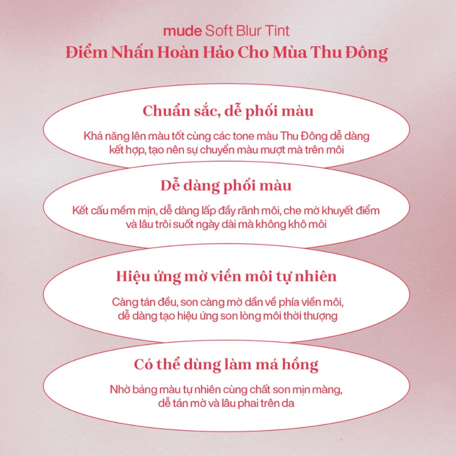 Mude Soft Blur Tint Son Kem Nhung Lì Mềm Mịn (3g) THÔNG TIN SẢN PHẨM ** Công dụng: - Lên môi chuẩn sắc với bảng màu sống động, dễ dàng kết hợp, tạo nên sự