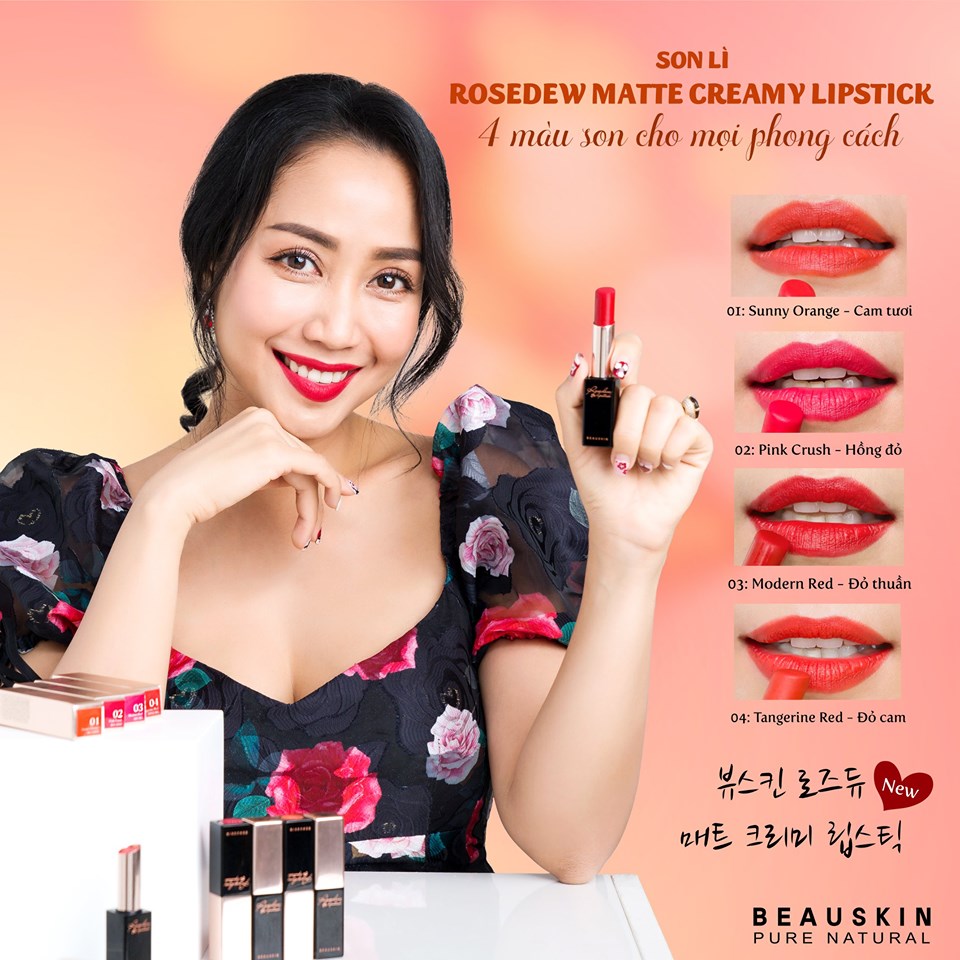 - Son có hương hoa hồng và cam rất dịu nhẹ, tự nhiên.. Bộ sưu tập son lì hoàn toàn mới gồm 4 tone màu đỏ lấy cảm hứng từ những cánh hoa hồng sang trọng và quyến rũ, giúp phái đẹp biến hóa đủ mọi phong cách từ năng động, dịu dàng đến thời thượng hay quyền lực 01: Sunny Orange - Cam tươi - Ngọt ngào như ánh nắng 02: Pink Crush - Hồng đỏ - Dịu dàng như kẹo ngọt 03: Modern Red - Đỏ thuần - Hiện đại và mạnh mẽ 04: Tangerine Red - Đỏ cam - Thu hút mọi ánh nhìn Bộ sưu tập son lì hoàn toàn mới gồm 4 tone màu đỏ lấy cảm hứng từ những cánh hoa hồng sang trọng và quyến rũ Giúp phái đẹp biến hóa đủ mọi phong cách từ năng động, dịu dàng đến thời thượng hay quyền lực Hướng dẫn sử dụng Bảo quản: Nơi khô ráo, thoáng mát. Thành phần: Xem trên bao bì Chỉ tiêu kích ứng: Không gây kích ứng
