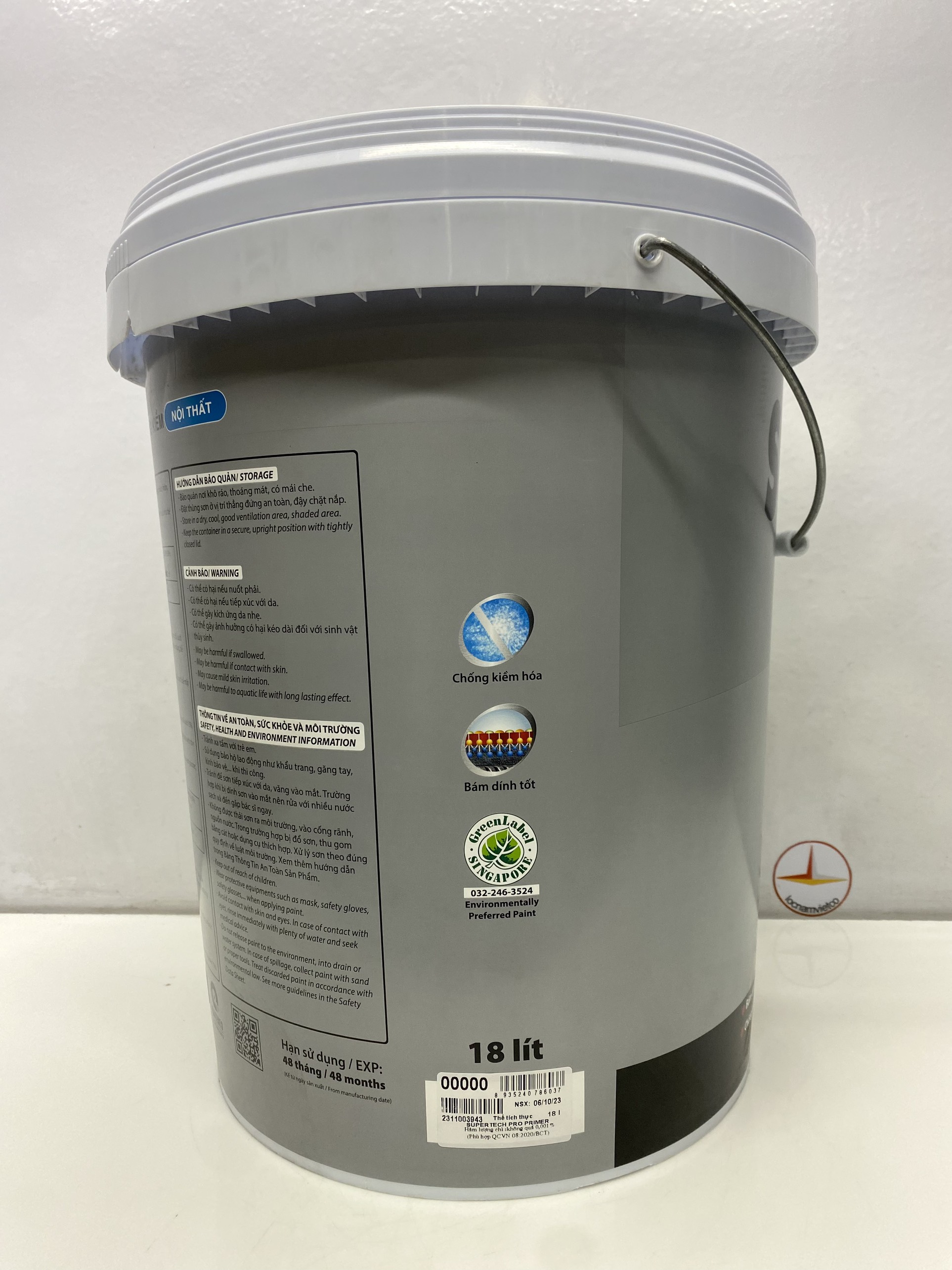 - Hàm lượng chất hữu cơ bay hơi (VOCs): ≤ 25 g/L Thời gian khô ở nhiệt độ 30 oC: khô bề mặt 30 phút ; khô cứng:4h Đóng gói: 18 lít; 5 lít Dụng cụ: Cọ, ru-lô/con lăn, súng phun sơn thông thường Tỷ lệ pha loãng:Sơn sẵn sàng sử dụng sau khi được khuấy trộn đồng nhất. Nếu có nhu cầu pha loãng, chỉ nên pha tối đa 5% với nước ngọt sạch. HƯỚNG DẪN THI CÔNG: Bước 1: - Xử lý bề mặt: Bề mặt mới: