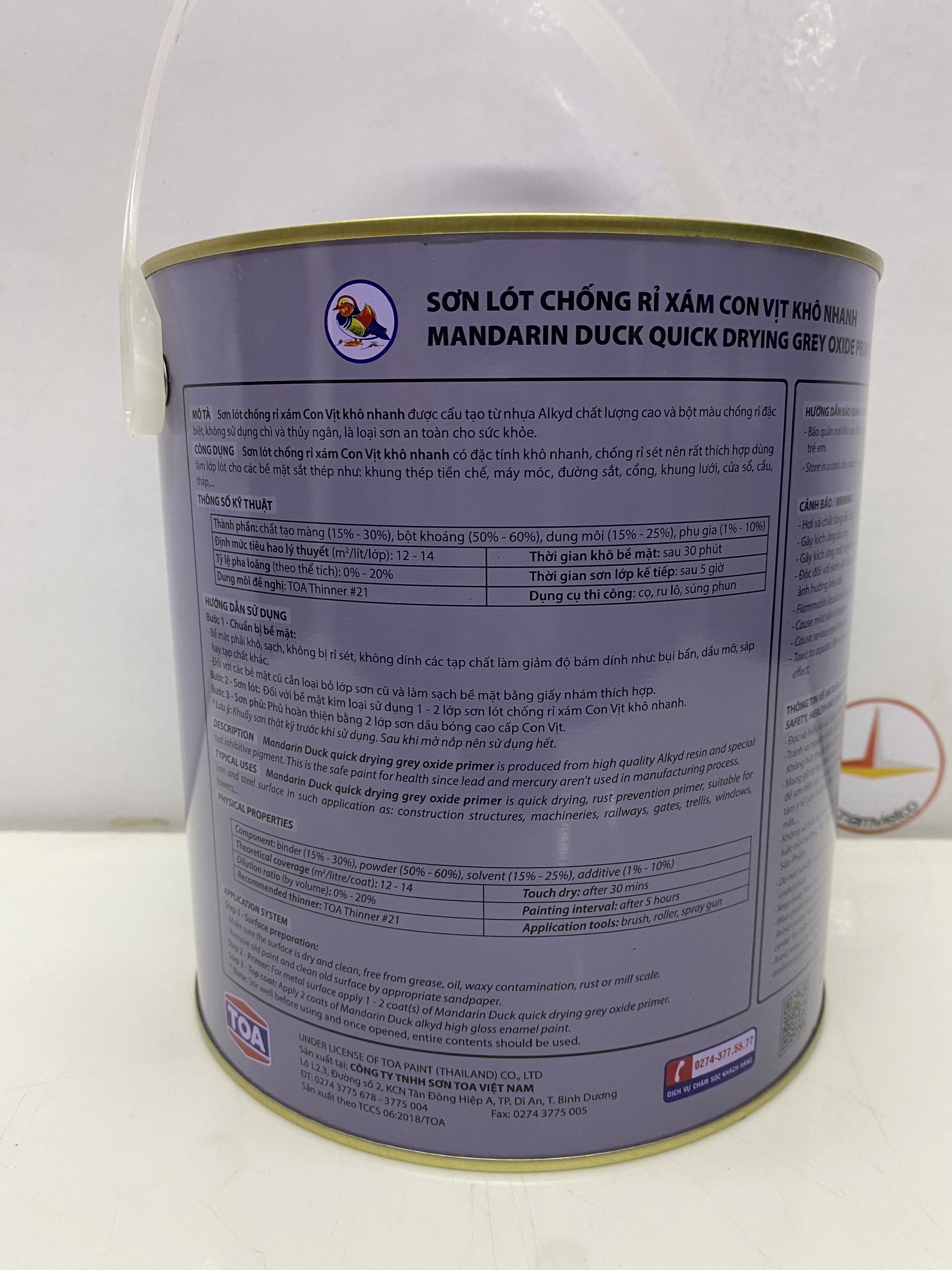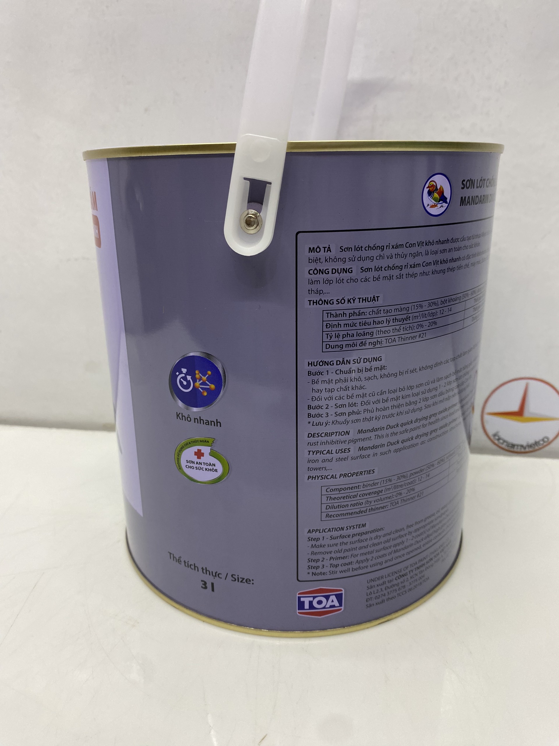 Mua tại TiktokSơn lót chống rỉ cao cấp màu xám Con Vịt_3L Sơn lót chống rỉ cao cấp màu xám Con Vịt được cấu tạo nhựa Alkyd chất lượng cao và bột màu chống rỉ đặc biệt, không sử dụng Chì & Chất gây hại, là loại sơn an toàn cho sức khoẻ người sử dụng.