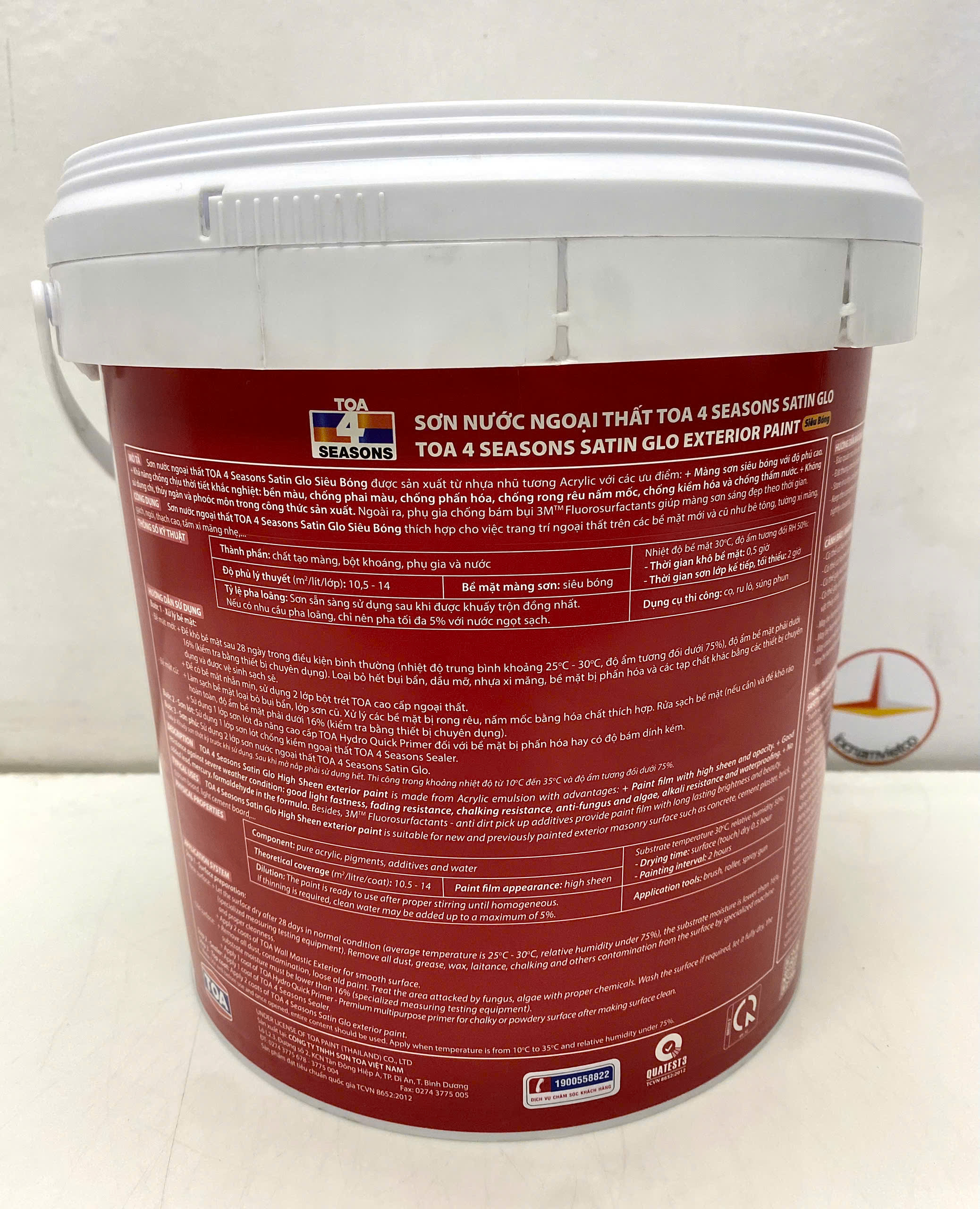 - MỤC ĐÍCH SỬ DỤNG: Sơn Nước Toa4 seasons satin glo siêu bóng thích hợp cho việc trang trí ngoại thất trên các bề mặt mới và cũ như tường xi măng, bê tông, thạch cao, gạch, ngói, tấm xi măng nhẹ, v.v… Đóng gói: 1L; 5L; 18L Thời gian khô ở nhiệt độ 30oC: khô bề mặt 30 phút ; khô cứng:4h