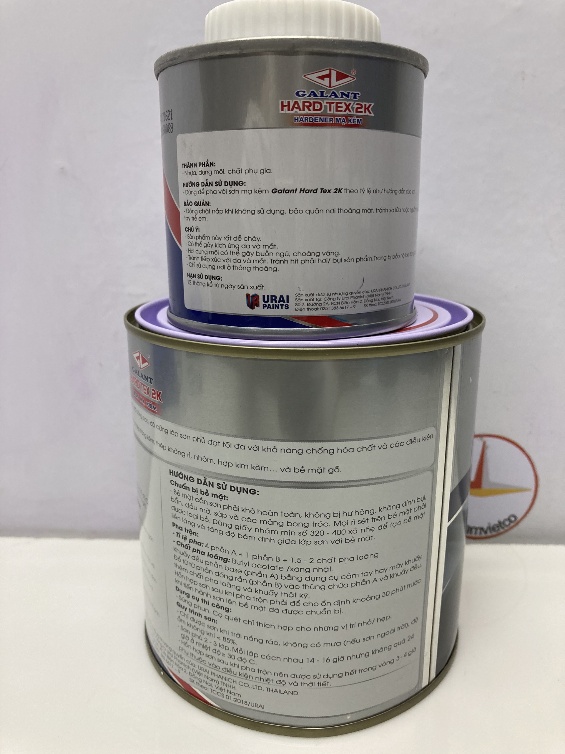 Mua tại TiktokSơn Sắt Kẽm Epoxy Hard Tex 2K (Đủ màu) 1L/bộ Đóng gói: 1L/bộ (Phần A "Sơn": 0.8L ; Phần B "Đóng rắn": 0.2L) Đặc điểm: - Nhanh khô: 10p – 15p (Dùng tốt cho mùa mưa) - Bám dính tốt, không bị bong tróc Thành Phần: nhựa, bột màu, dung môi, chất phụ gia. HƯỚNG DẪN SỬ DỤNG - Tỉ lệ pha trộn: 4 phần A + 1 Phần B + 1,5 chất pha loãng - Thời gian khô bề mặt : <2 giờ - Thời gian sử dụng sau khi pha trộn 2 thành phần : 3-4 giờ - Thời gian để sơn lớp kế tiếp: 14-16 giờ ở nhiệt độ 30 độ C Sản phẩm được phân phối bởi: Công ty TNHH Lộc Nam Việt 1933 QL51, Phước Tân, Biên Hòa, Đồng Nai ' 0948 79 5588'