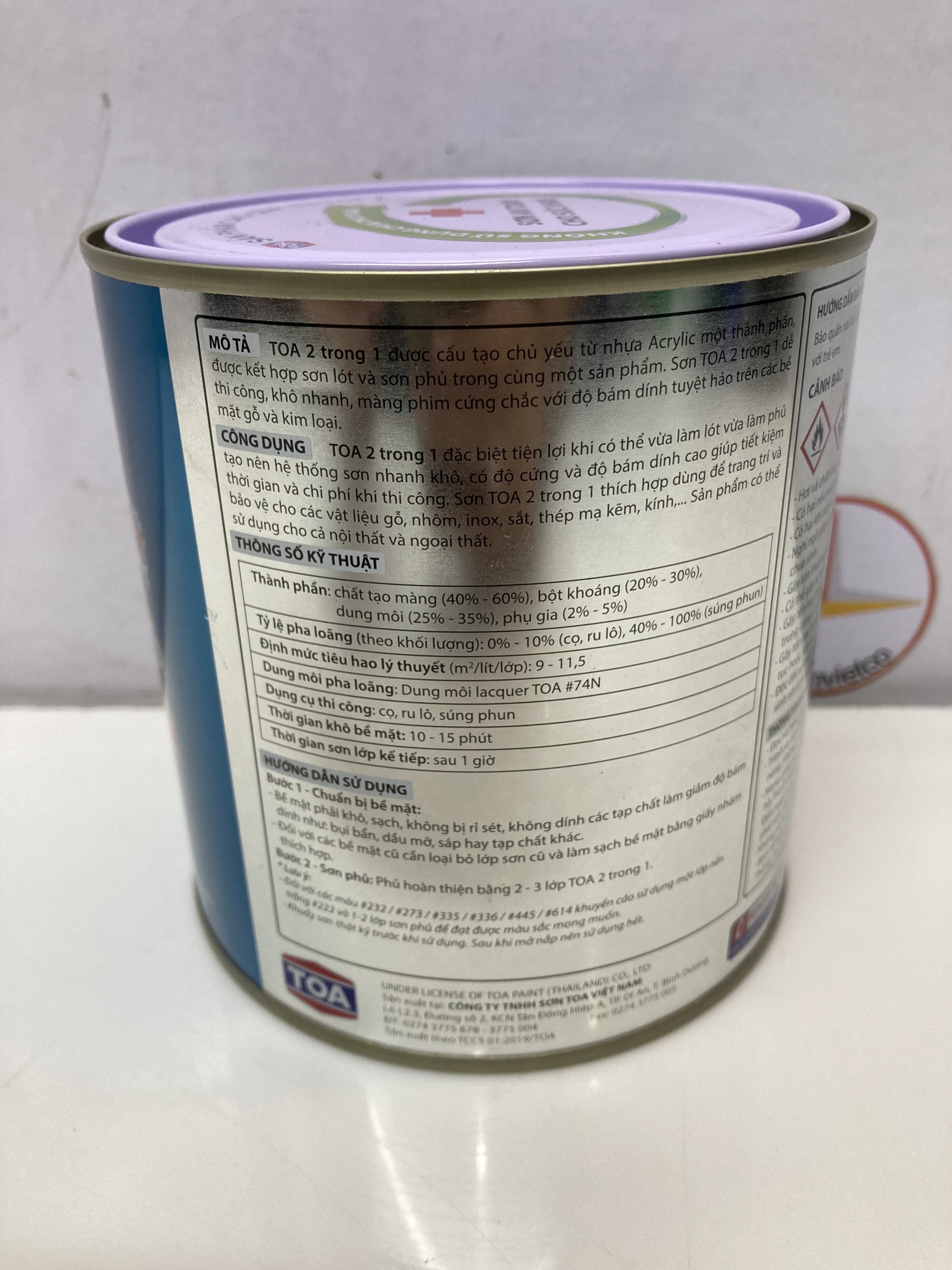 - Sơn an toàn cho sức khỏe Sơn Toa 2 trong 1 thích hợp sử dụng lên các bề mặt thép mạ kẽm,inox, nhôm, sắt, gỗ, à không cần sử dụng lớp sơn lót chống rỉ, sử dụng cho cả trong nhà và ngoài trời Thông số kỹ thuật: