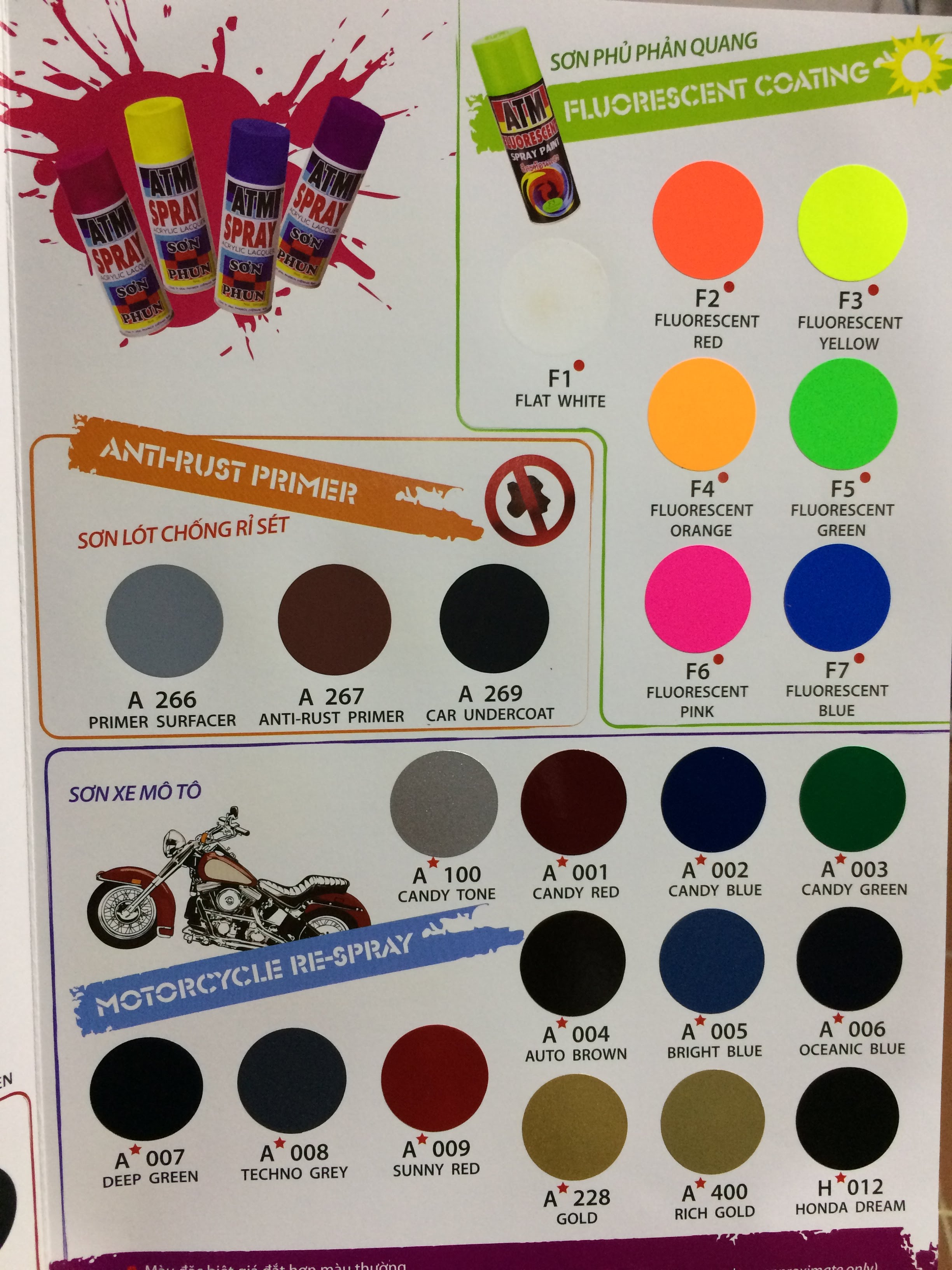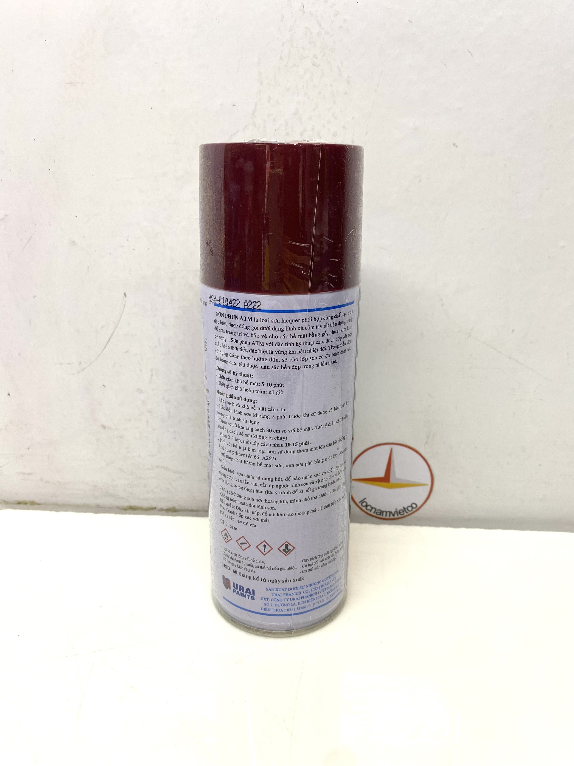 Mua tại TiktokSơn xịt màu đỏ mận ATM A 222 SƠN PHUN “ATM” ACRYLIC: Đặc chế từ hỗn hợp nhựa N/C và ACRYLIC, được đóng gói dưới dạng bình xịt cầm tay rất tiện dụng, dùng sơn để trang trí cho các bề mặt bằng gỗ và kim loại như: đồ gia dụng, bàn, ghế, đồ chơi trẻ em, xe đạp, xe máy
