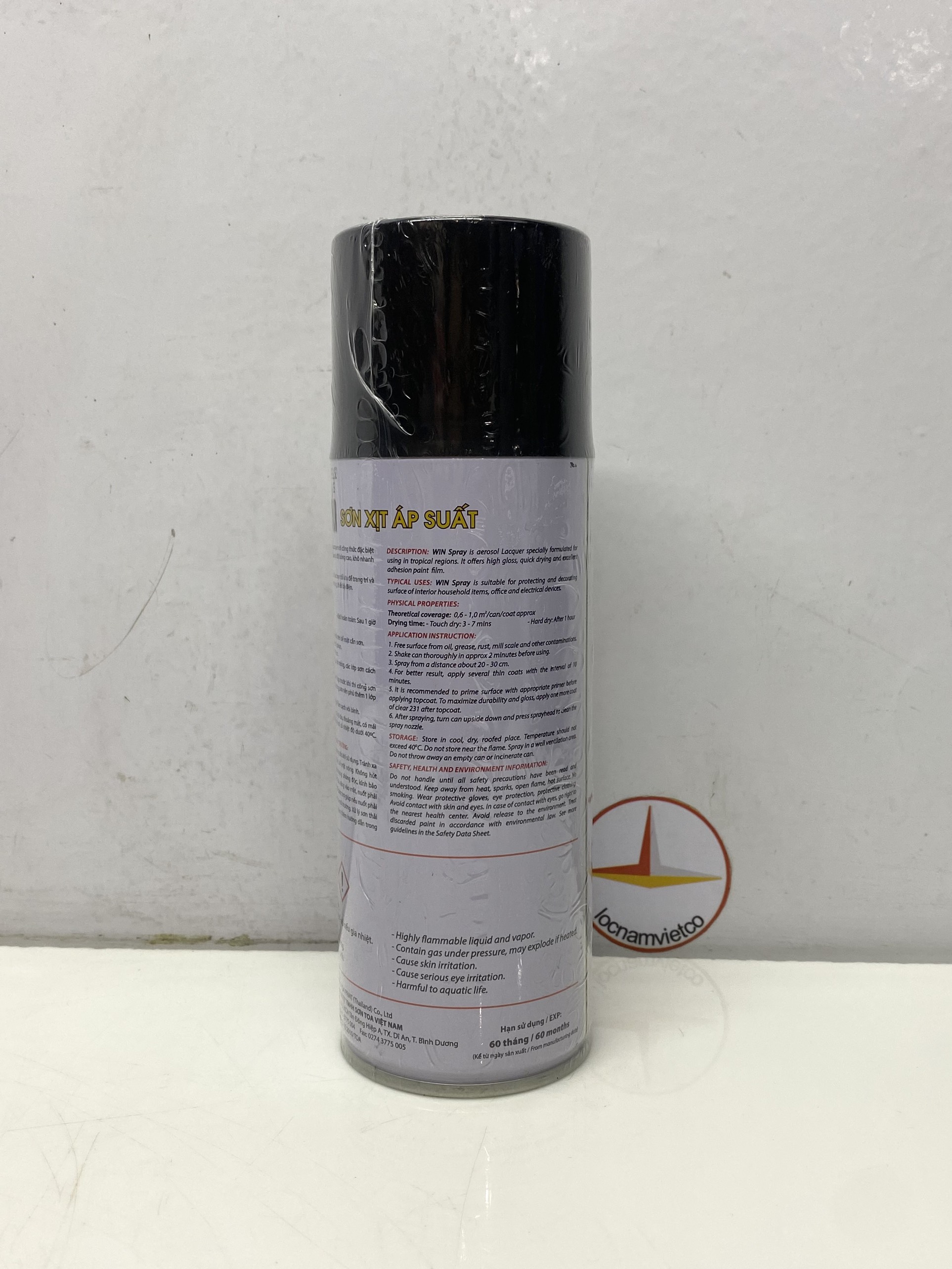 Mua tại TiktokSƠN XỊT WIN MÀU ĐEN MỜ 212 400ML Sơn xịt WIN là loại sơn Lacquer với công thức đặc biệt thích hợp sử dụng cho vùng nhiệt đới. Sơn có độ bóng cao, khô nhanh và độ kết dính tuyệt hảo. Công dụng: Sơn xịt WIN là sự lựa chọn tối ưu để trang trí và bảo vệ cho các vật dụng nội thất, văn phòng, thiết bị điệ Thành phần: Chất tạo màng ; Bột màu ; Dung môi , Phụ Độ phủ lý thuyết:0.6 - 1 m²/lon/lớp (tùy thuộc vào màu) Đóng gói: 400ml/chai; 12 chai/thùng Thời gian khô :