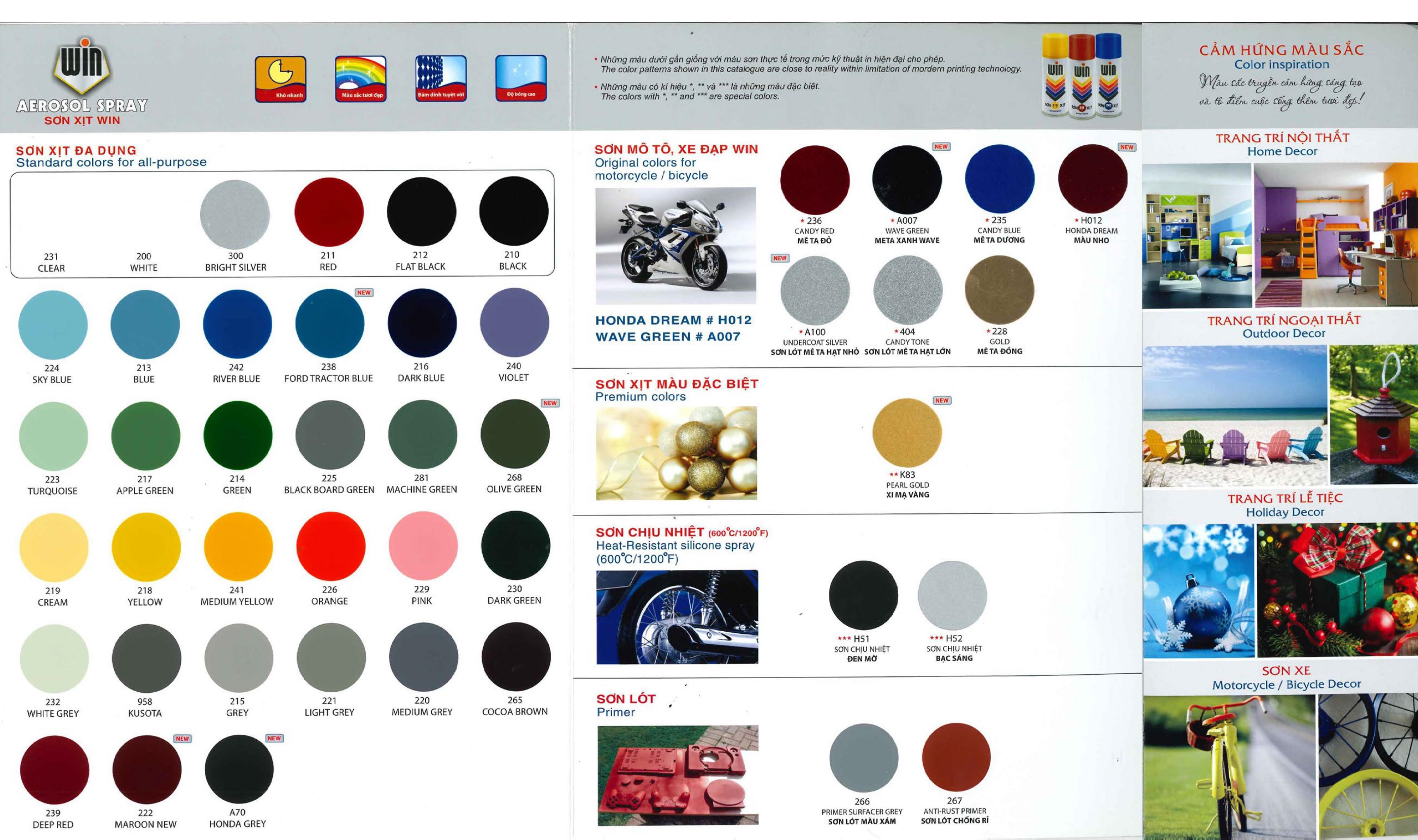 - Khô hoàn toàn:Sau 1 giờ Một số mã màu sơn xịt Win khác: Clear 231(Không màu); màu trắng white 200; màu bạc bright silver; màu đỏ 211 red; màu đen mờ flat black 212; màu đen black 210; màu xanh 224 sky blue; màu xanh 213; màu xanh river blue 242; màu xanh ford tractor blue 238; màu xanh đen dark blue 216; màu tím 240 violet; turquoise 223; màu xanh apple green 217; màu xanh green 214; màu black board green 225; machine green 281; olive green 268; màu kem 219 cream; màu vàng yellow 218; màu vàng medium yellow 241 màu cam 226 orange; màu hồng pink 229; màu xanh đen dark green 230; màu trắng xám 232; màu xám kusota 958; màu xám grey 215; màu xám sáng light grey 221; màu xám medium grey 220; màu nâu cocoa brown 265; màu đỏ deep red 239; màu maroon new 222; màu grey A70 Sơn xe mô tô, xe máy, xe đạp WIN: Màu mêta đỏ candy red 236; màu meta xanh wave green A007; màu meta xanh dương candy blue 235; Màu nho dream H012; Sơn nhũ bạc meta hat nhỏ undercoat silver A100; sơn nhũ bạc mê ta hạt lớn candy tone 404 màu candy green 234; màu mêta đồng gold 228. Sơn xịt màu đặc biệt: Màu xi mạ vàng K83 Pearl gold Sơn xịt chịu nhiệt(600 độ C/ 1200 độ F): Sơn chịu nhiệt đen mờ H51, sơn chịu nhiệt bạc sáng H52 Sơn lót chống rỉ: Sơn lót màu xám primer surfacer grey 266; sơn lót chống rỉ màu đỏ chu Anti-rust primer 267. HƯỚNG DẪN THI CÔNG: