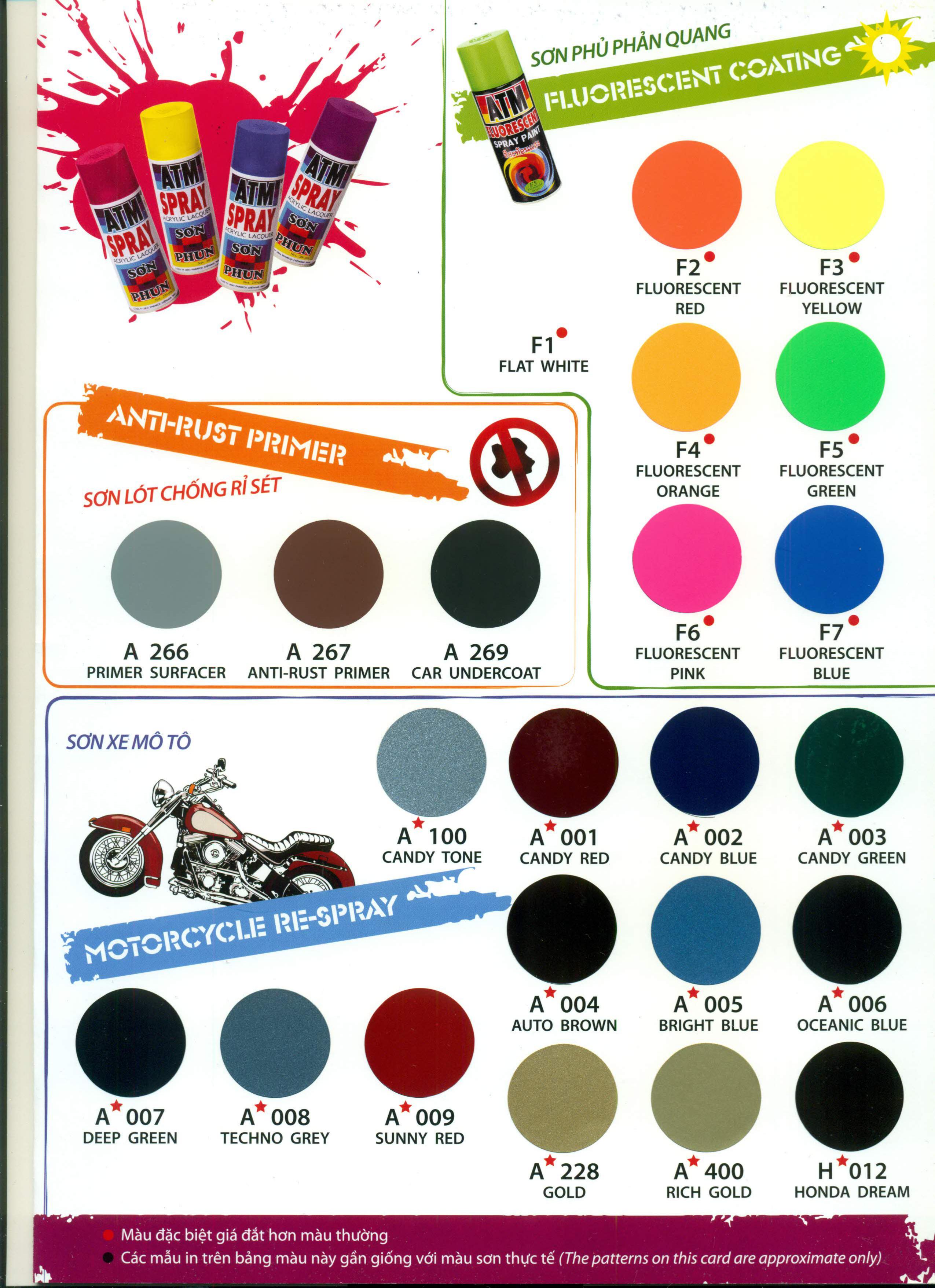 SƠN PHUN “ATM” ACRYLIC: Đặc chế từ hỗn hợp nhựa N/C và ACRYLIC, được đóng gói dưới dạng bình xịt cầm tay rất tiện dụng, dùng sơn để trang trí cho các bề mặt bằng
