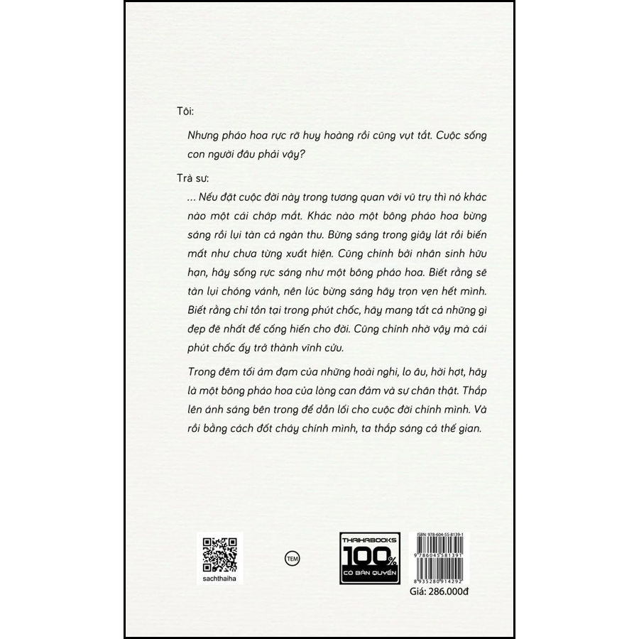 Những triết lý về cách sống giản dị mà sâu sắc ấy khiến chúng ta hiểu được sứ mệnh của mình giữa thế giới rộng lớn: Là một bông pháo hoa rực rỡ và hiến dâng những gì đẹp đẽ nhất cho cuộc đời. Dù chỉ sáng bừng trong khoảnh khắc, nhưng ta đã sống hết mình và nhờ đó cũng thắp sáng biết bao tâm hồn khác. Chính vì cách sống nhiệt thành và cho đi vô điều kiện ấy, chúng ta chạm gần hơn tới những vì sao.