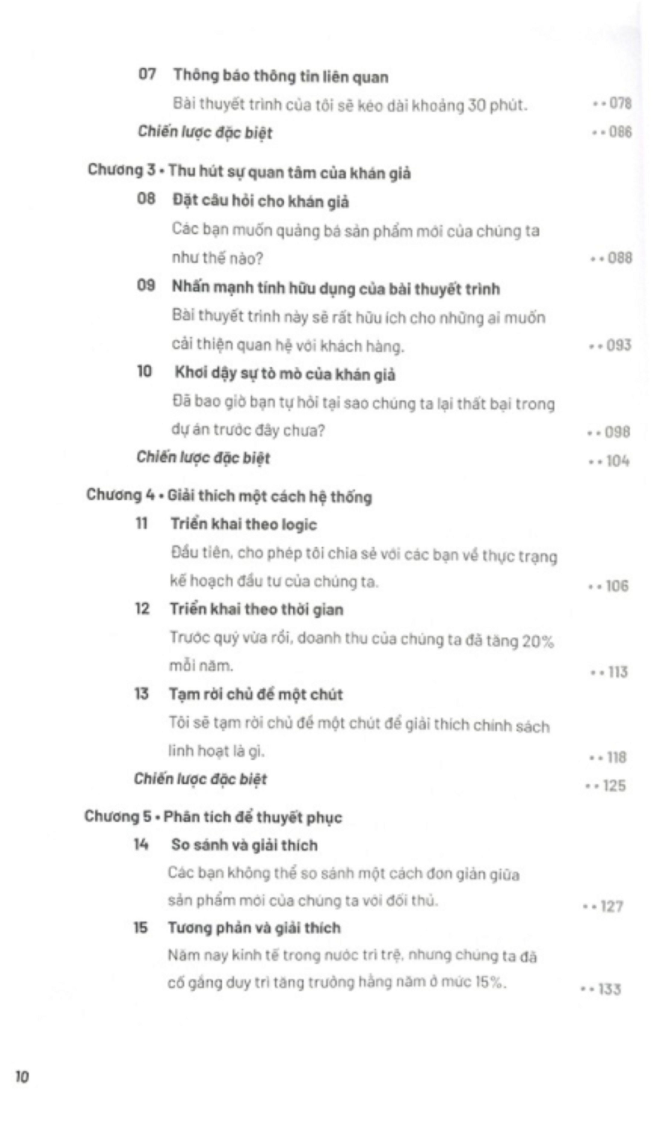 - Về tính ứng dụng Ở ngay phần đầu, cuốn sách cung cấp các mẹo hữu ích cho người học tự chuẩn bị bài thuyết trình. Sau 3-4 bài học, các tác giả bổ sung thêm phần “Chiến lược đặc biệt” do các chuyên gia khuyến nghị, giúp người thuyết trình tăng độ thu hút cho bài nói.