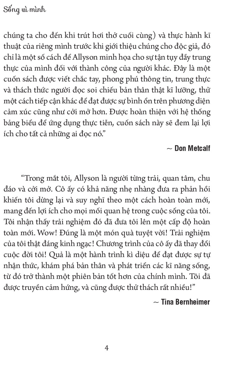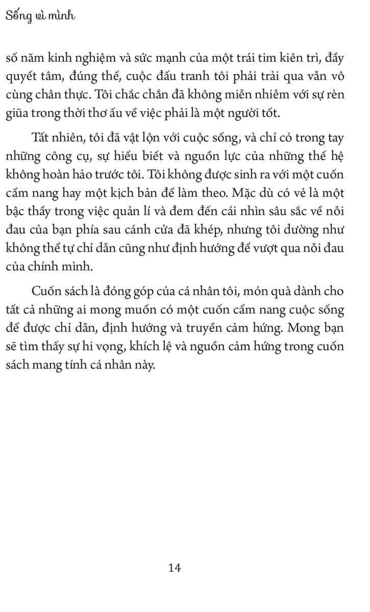 Sống Vì Mình Bạn có cảm thấy bất hạnh không? Bạn có cảm thấy bị đối xử tàn tệ không? Bạn có xu hướng nỗ lực rất nhiều trong mối quan hệ không? Bạn có kiệt quệ hay cạn năng lượng không? Bạn có cảm thấy không được trân trọng không? Bạn có đang làm việc quá sức không? Hay bị trả lương quá thấp không? Nếu câu trả lời là có cho một hoặc nhiều câu hỏi ở trên, cuốn sách này là dành cho bạn! Nếu bạn nhận ra những cảm giác này hoặc thấy mình ở trong bất cứ tình trạng nào như đã kể trên mà không thể thoát ra, đã đến lúc tự hỏi bản thân rằng mình đang cho phép điều gì xảy ra? Sự thật khó chấp nhận là, không có tình trạng nào trong số những tình trạng kể trên có thể tồn tại lâu dài mà không có sự cho phép của bạn. Nếu bạn đang ở trong những tình huống hoặc mối quan hệ chỉ đem lại cảm giác tiêu cực, thì có nghĩa là bạn đang tiếp tay hoặc chấp nhận một điều gì đó. Những trạng thái dài hạn này không ngẫu nhiên xảy ra mà cần đến sự thuận theo của họ. Cuốn sách là hành trình hướng vào các tổn thương bên trong Cuốn sách SỐNG VÌ MÌNH là một cuộc hành trình hướng vào bên trong, để bạn nhìn vào những gì bạn đang cho phép xảy ra trong cuộc sống của mình. Cuốn sách là món quà tri thức, sự thấu hiểu và các công cụ để giúp bạn chịu trách nhiệm hoàn toàn cho cuộc sống của mình. Cuốn sách là một hành trình nội tâm của công cuộc khám phá bản thân, sự trung thực và trách nhiệm cá nhân, để soi sáng những góc sâu kín nhất của cảm xúc, suy nghĩ, niềm tin, nhu cầu, thói quen, và khuôn mẫu hành động của bạn. Cuốn sách giúp bạn tự chịu trách nhiệm cho cuộc sống của mình Không phải lúc nào bạn cũng đạt được những gì mình muốn, nhưng như Mick Jagger đã hát: "Nếu thỉnh thoảng cố gắng, bạn sẽ tìm được những gì mình cần." SỐNG VÌ MÌNH, như cái tên của nó, dẫn bạn bước lên con đường tự chịu trách nhiệm cho hạnh phúc của chính mình. Con đường đó dẫn tới đâu? Mời bạn cùng Minh Long khám phá trong cuốn sách này, bạn sẽ không thất vọng!