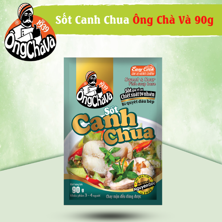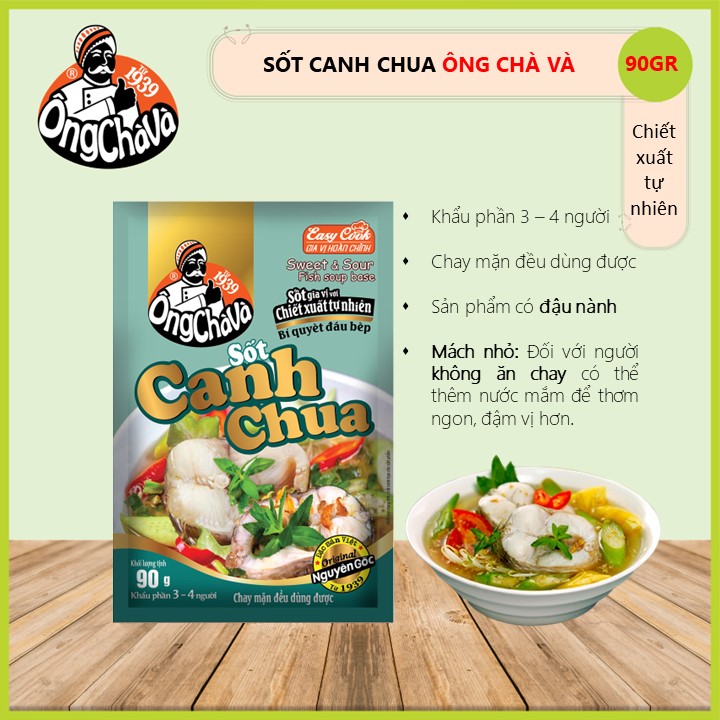 - Hướng dẫn sử dụng: + Bước 1: Xào cà chua và thơm trước, thêm 1,5L nước, đun sôi, cho 1 gói Sốt Canh Chua Ông Chà Và 90g vào khuấy đều, cho cá/tôm vào đun tiếp từ 1-2 phút.. + Bước 2: Thêm rau vào đun sôi trở lại rồi tắt bếp. + Mách nhỏ: Đối với người không ăn chay có thể thêm nước mắm để thơm ngon đậm vị hơn.