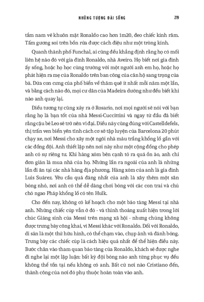 World Cup 2022 có lẽ là giải vô địch thế giới cuối cùng với cả Messi và Ronaldo. Do đó, cuốn sách này cũng dành nhiều trang đánh giá về di sản của họ cho bóng đá, cũng như phân tích những ảnh hưởng mà tài năng của họ tạo ra, cả tích cực lẫn tiêu cực. Hơn cả việc đơn thuần liệt kê những thành tích của hai siêu sao, đây thực sự là một “tiểu sử của cuộc đua tranh” vốn đã trở thành một lăng kính quan trọng để hiểu về quá khứ, hiện tại và tương lai của bóng đá thế giới .