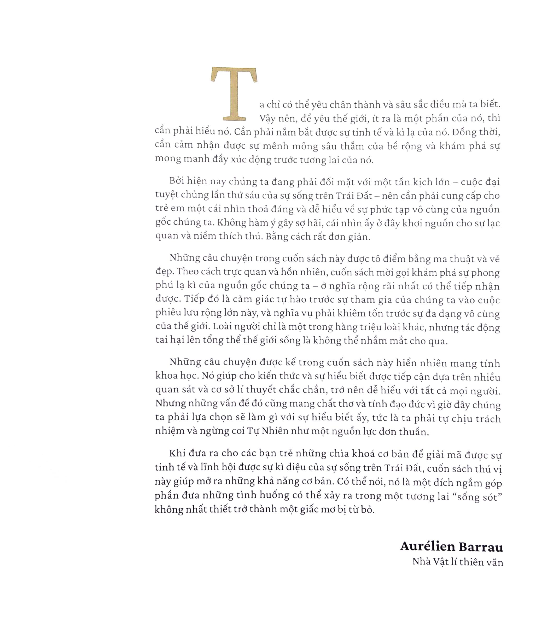 Qua 100 câu chuyện được diễn đạt theo lối kể chuyện, cuốn sách tựa như một thiên sử thi kể lại sự hình thành của Vũ Trụ, Trái Đất và muôn loài, TẤT TẦN TẬT, TỪ ĐẦU CHÍ CUỐI, với vô vàn nhân vật sinh động cùng đời sống đầy thăng trầm của họ.