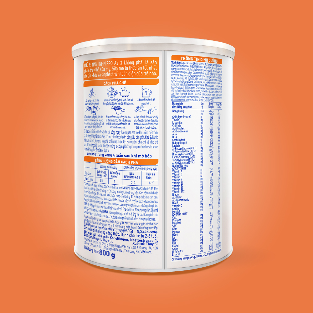 Mua tại TiktokTên sản phẩm: Sản phẩm dinh dưỡng công thức Nestlé NAN INFINIPRO A2 3 800g Xuất xứ: Thụy Sĩ Khối lượng tịnh: 800g/lon Độ tuổi phù hợp: 2 - 6 tuổi Thành phần: SỮA A2 tách kem 29% (A2 Skimmed MILK powder), LACTOSE (từ SỮA-from MILK), WHEY khử khoáng (từ SỮA-WHEY PROTEIN from MILK), Hỗn hợp dầu (dầu hướng dương giàu acid Oleic, dầu hạt cải có hàm lượng acid Erucic thấp, dầu hướng dương, dầu nấm Mortierella alpina, dầu vi tảo Schizochytrium sp., chất chống oxy hóa (Tocopherol concentrat dạng hỗn hợp, Ascorbyl palmitat)), Các vitamin (C, E, Nicotinamid, B5, B1, A, B6, B2, Acid folic, K1, Biotin, D3, B12), Các khoáng chất (Calci citrat, Natri citrat, Dikali hydro phosphat, Magnesi Clorid, Sắt (II) sulphat, Kali citrat, Kẽm sulfat, Đồng sulfat, Mangan sulfat, Kali iodid, Natri selenat), Oligosaccharide (3-Fucosyllactose, 2'-Fucosyllactose, Lacto-N-tetraose, 3'-Sialyllactose, 6'-Sialyllactose, Difucosyllactose), Maltodextrin, Chất nhũ hóa Lecithin ĐẬU NÀNH (SOYA lecithin), Choline bitartrate, Taurine, Chất điều chỉnh độ acid Natri hydroxyd, Inositol, Lợi khuẩn (Bifidobacterium longum subsp. infantis, Bifidobacterium lactis), Nucleotide (Cytidine, Uridine, Adenosine, Guanosine), Chất điều chỉnh độ acid Acid citric, L-carnitine. () có chứa LACTOSE (contain LACTOSE) Cảnh báo: Không sử dụng cho trẻ bị dị ứng với các thành phần của sản phẩm. Nên có sự hướng dẫn của bác sĩ trước khi dùng đối với trẻ không dung nạp đường lactose. Cách pha chế: