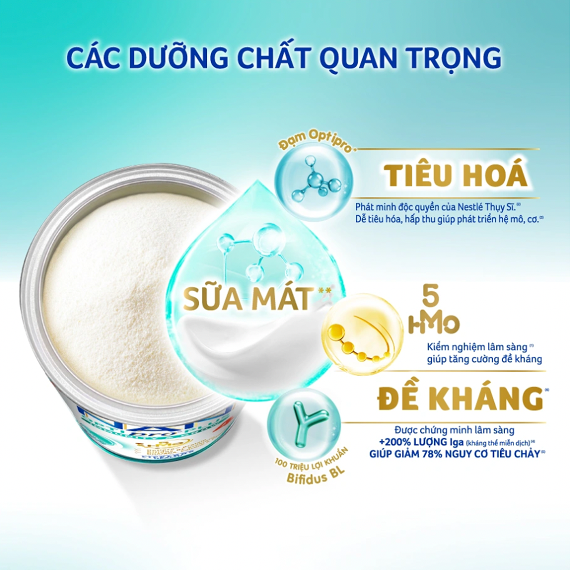 Thấu hiểu tâm lý của mẹ luôn muốn kiếm tìm những sản phẩm tốt nhất cho con, với kinh nghiệm 155 năm trong phát triển dưỡng nhi, Nestlé cho ra đời dòng sản phẩm sữa mát Thụy Sĩ NAN OPTIPRO PLUS 4 giúp tiêu hóa tốt, từ đó tăng cường đề kháng nhờ: phức hợp 5HMO, 100 triệu lợi khuẩn Bifidus BL, đạm chất lượng Optipro, DHA/ARA, Canxi & Vitamin D. Sản phẩm với công thức mới đột phá từ Thuỵ Sĩ, nhập khẩu chính hãng bởi Nestlé Việt Nam được kiểm tra nghiêm ngặt về chất lượng và an toàn sản phẩm của Nestlé toàn cầu.