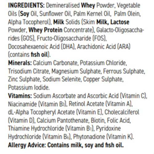 - Thành phần: Bột whey khử khoáng, dầu thực vật (dầu đậu nành, dầu hướng dương, dầu hạt cọ, dầu cọ, alpha tocopherol), sữa đặc (sữa tách béo, bột lactose, whey protein cô đặc), Galacto-Oligosaccharide (GOS), Fructo-oligosaccharide, acid docosahexaenoic (DHA), acid arachidonic (ARA) (chứa dầu cá). Các khoáng chất: calci carbonat, kali clorid, trinatri citrat, magnesi sulphat, sắt sulphat, kẽm sulfat, natri selenit, đồng sulfat, kali iodid. Các vitamin: Natri ascorbat và acid ascorbic (vitamin C), niacinamide (vitamin B3), retinol acetat (vitamin A), Dl-alpha tocopheryl acetat (Vitamin E), cholecalciferol (Vitamin D), calci pantothenat, biotin, acid folic, thiamin hydroclorid (Vitamin B1), pyridoxin hydroclorid (Vitamin B6), phytonadione (Vitamin K).