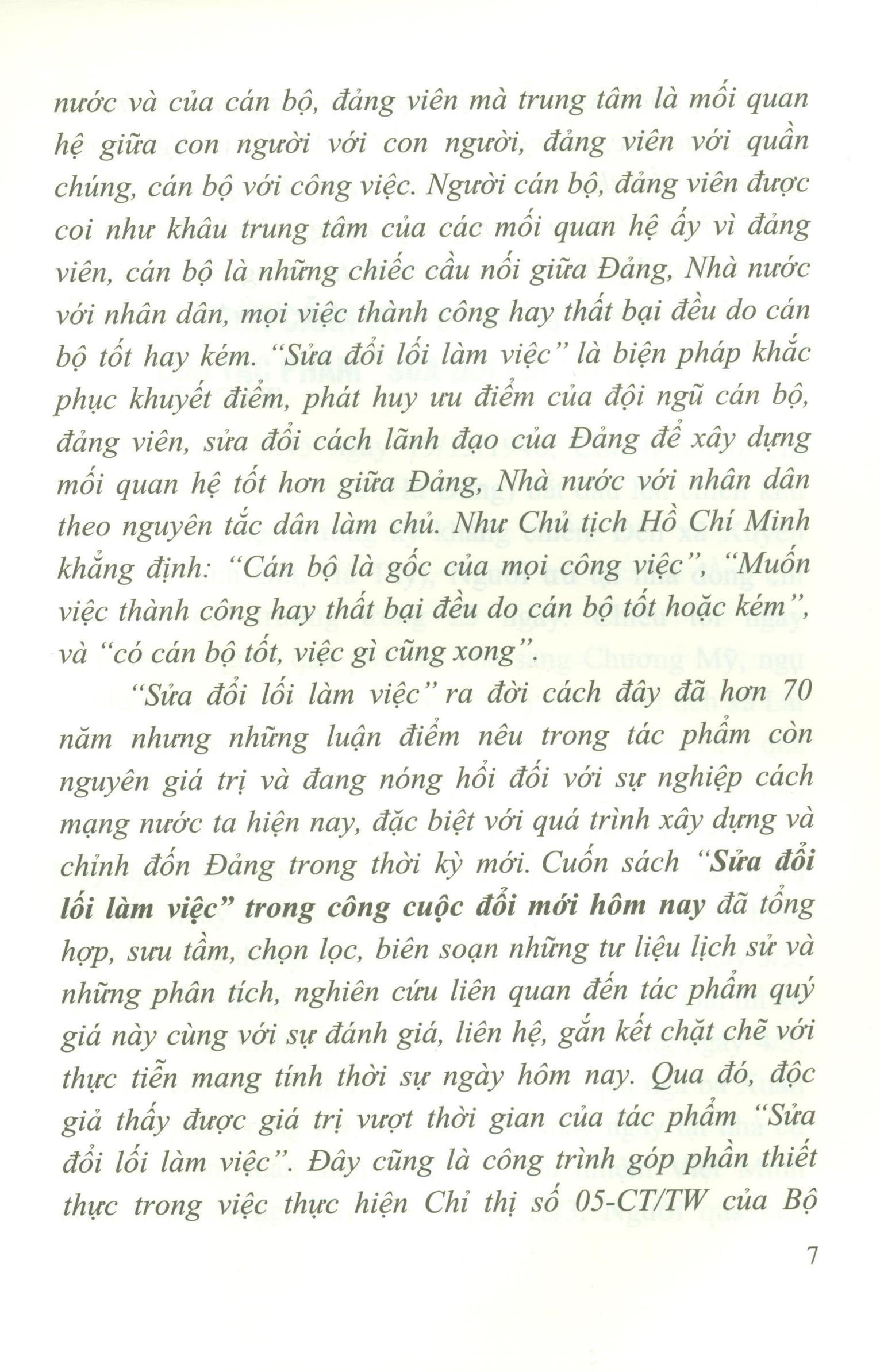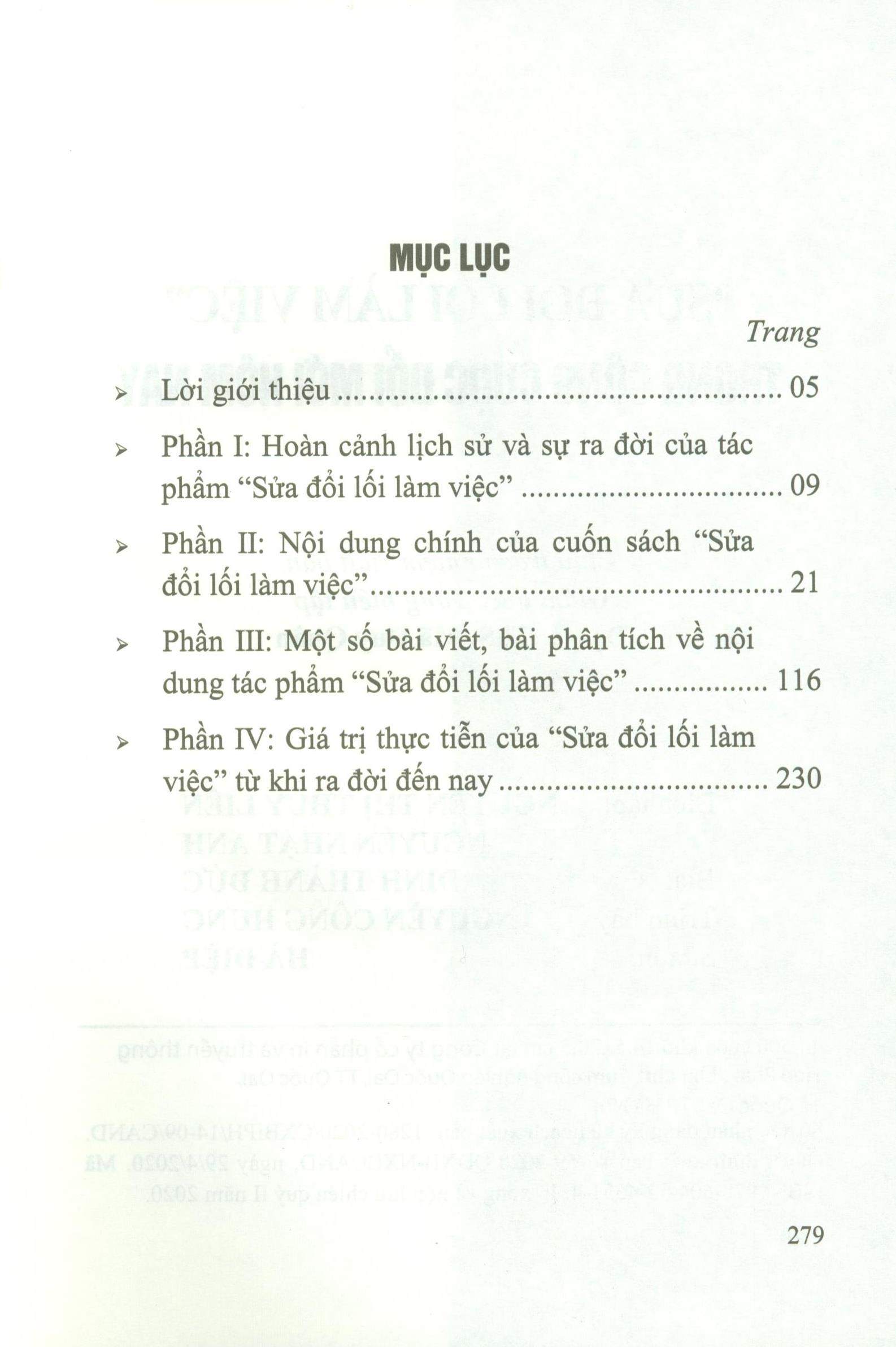 “Sửa đổi lối làm việc” ra đời cách đây đã hơn 70 năm nhưng những luận điểm nêu trong tác phấm còn nguyên giá trị và đang nóng hổi đối với sự nghiệp cách mạng nước ta hiện nay, đặc biệt với quá trình xây dựng và chỉnh đốn Đảng trong thời kỳ mới. Cuốn sách “Sửa đổi lối làm viềc” trong công cuộc đổi mới hôm nay đã tổng hợp, sưu tầm, chọn lọc, biên soạn những tư liệu lịch sử và những phân tích, nghiên cứu liên quan đên tác phâm quý giá này cùng với sự đánh giả, liên hệ, gắn kết chặt chẽ với thực tiễn mang tính thời sự ngày hôm nay. Qua đó, độc giả thấy được giá trị vượt thời gian của tác phẩm “Sửa đổi lối làm việc”. Đây cũng là công trình góp phần thiết thực trong việc thực hiện Chỉ thị số 05-CT/TW của Bộ