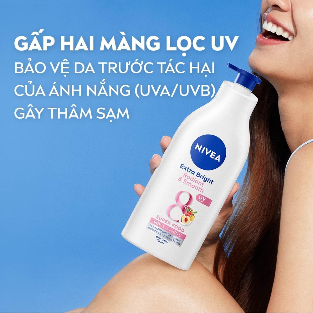 Sữa Dưỡng Thể NIVEA Extra Bright Dưỡng Sáng Da | Mịn Da (350 ml) CÔNG DỤNG - Dưỡng da sáng mịn từ bên trong, màng lọc tia UV giúp bảo vệ da khỏi tác hại