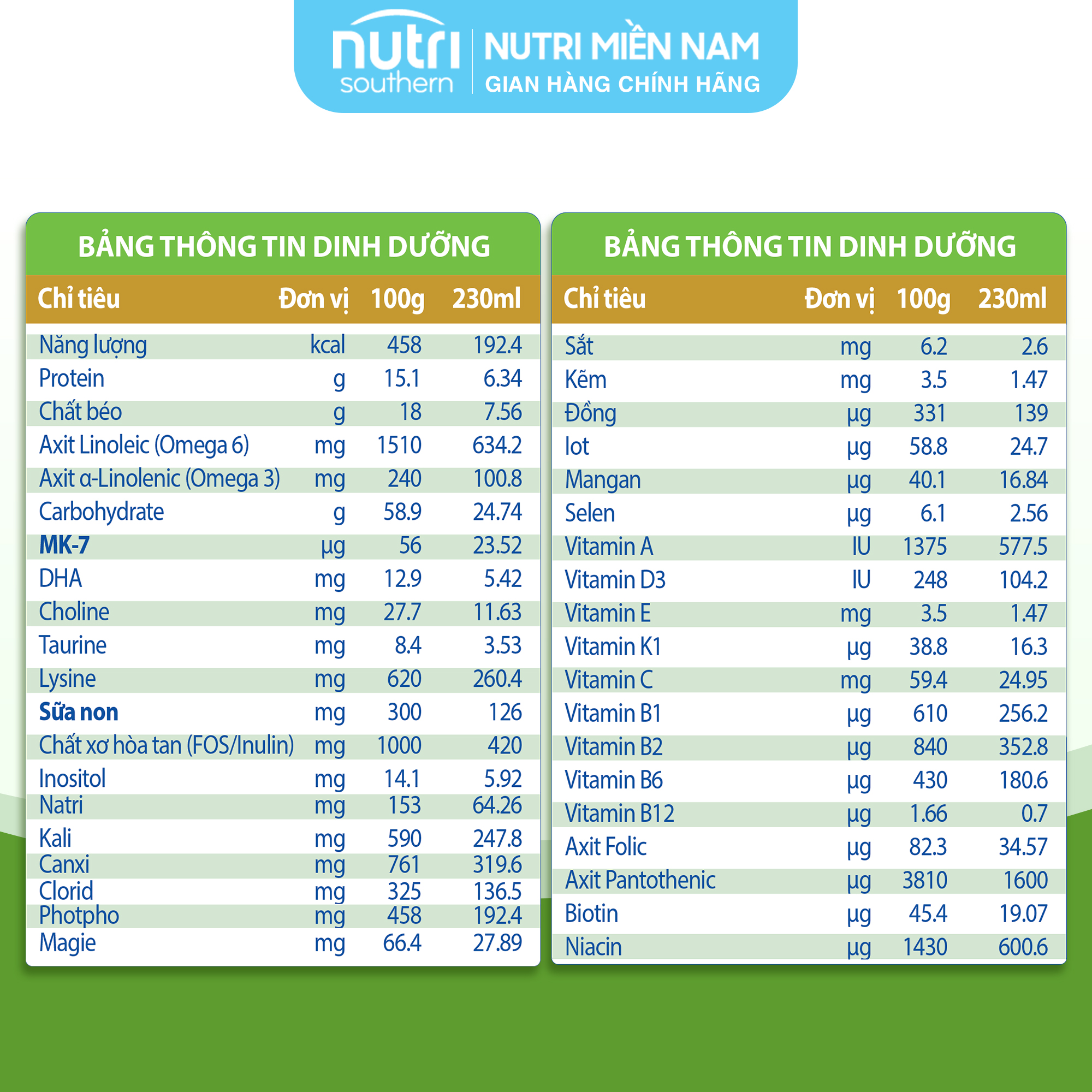 Năng lượng(Energy) 458Kcal, Protein15g, Chất béo 18g, Axit A –Linolenic (Omega 3) 230mg, Carbohydrate 59g, MenaQ7 MK-7 50mcg, DHA12mg, Choline 30mg, Taurine 7.7mg, Lysine 620mg, Natri 162mg, Kali 588mg, Canxi 761mg, Clorid 337mg, Photpho 463mg, Magie 61.9mg, Sắt 5.2mg, Kẽm 3.1mg, Vitamin A 1320IU, Vitamin D3 237UI, Vitamin E 4.3mg,…