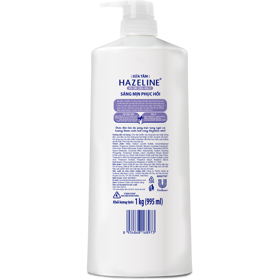 BAO BÌ THAY ĐỔI THEO TỪNG ĐỢT NHẬP HÀNG Sữa tắm Hazeline hoàn toàn mới, với bộ ba vitamin B3 – C – E và 100% chiết xuất thiên nhiên, cùng các siêu dưỡng chất giúp nhân ba tác động sáng da, đem lại làn da sáng rạng ngời thuần khiết. Đồng thời, công thức mới tăng thêm hương thơm, giúp lưu hương quyến rũ tới 8h. Sữa Tắm Hazeline Dưỡng Thể Trắng Sáng Mịn & Phục Hồi Da Từ Thiên Nhiên Sữa Ong Chúa Hoa Ly Bụi bẩn, ô nhiễm và nắng nóng sẽ khiến da trở nên khô sạm và dễ xuất hiện các dấu hiệu lão hóa. Với chiết xuất từ sữa ong chúa tự nhiên giàu vitamin & amino acid, giúp nuôi dưỡng và phục hồi da, Hazeline mang đến cho bạn một làn da sáng mịn rạng ngời, thơm hương cuốn hút.