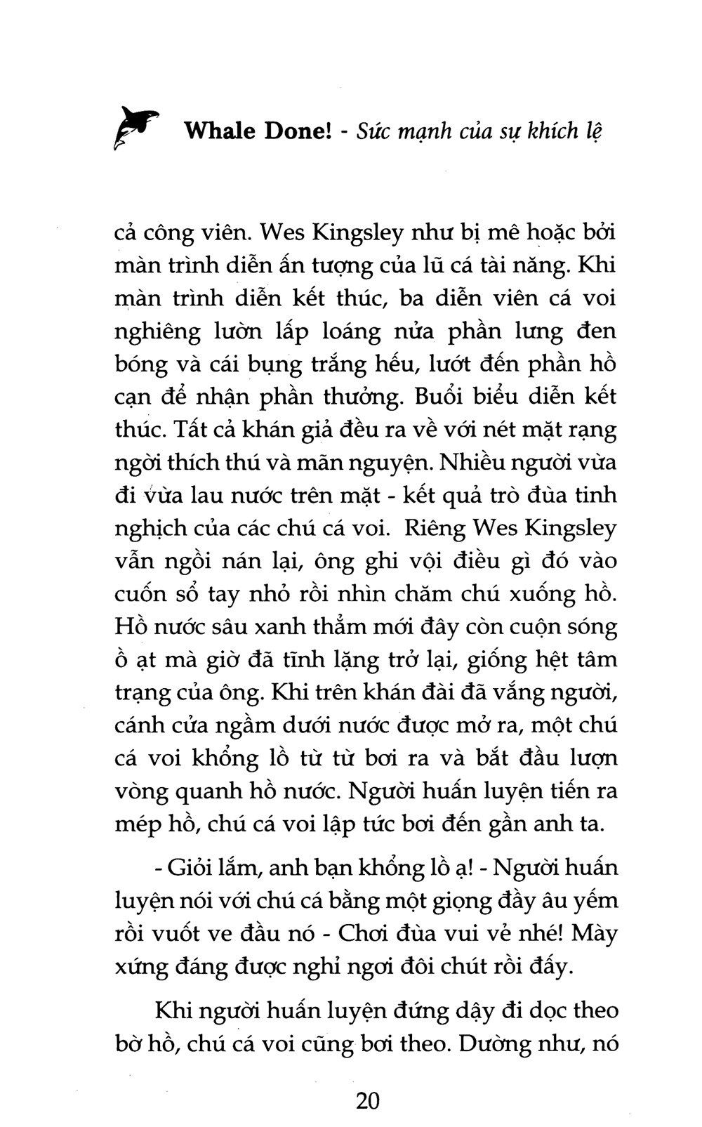 Trong những lúc chúng ta phải đối mặt với thất bại, lo lắng, bế tắc trong công việc, cuộc sống thì chính sự khích lệ, cảm thông sẽ là nguồn động viên lớn lao tiếp thêm nhiệt tình để chúng ta vượt qua những khó khăn mà tiếp tục theo đuổi mục tiêu. Tiến sĩ Ken Blanchard đã rút ra được kinh nghiệm quí báu đó khi làm việc với những người huấn luyện cá voi ở Công viên Thế giới Đại dương (Orlando, Florida) để rồi chia sẻ với bạn đọc trong cuốn sách nổi tiếng đầy cảm hứng và thú vị Whale Done! - Sức Mạnh Của Sự Khích Lệ.