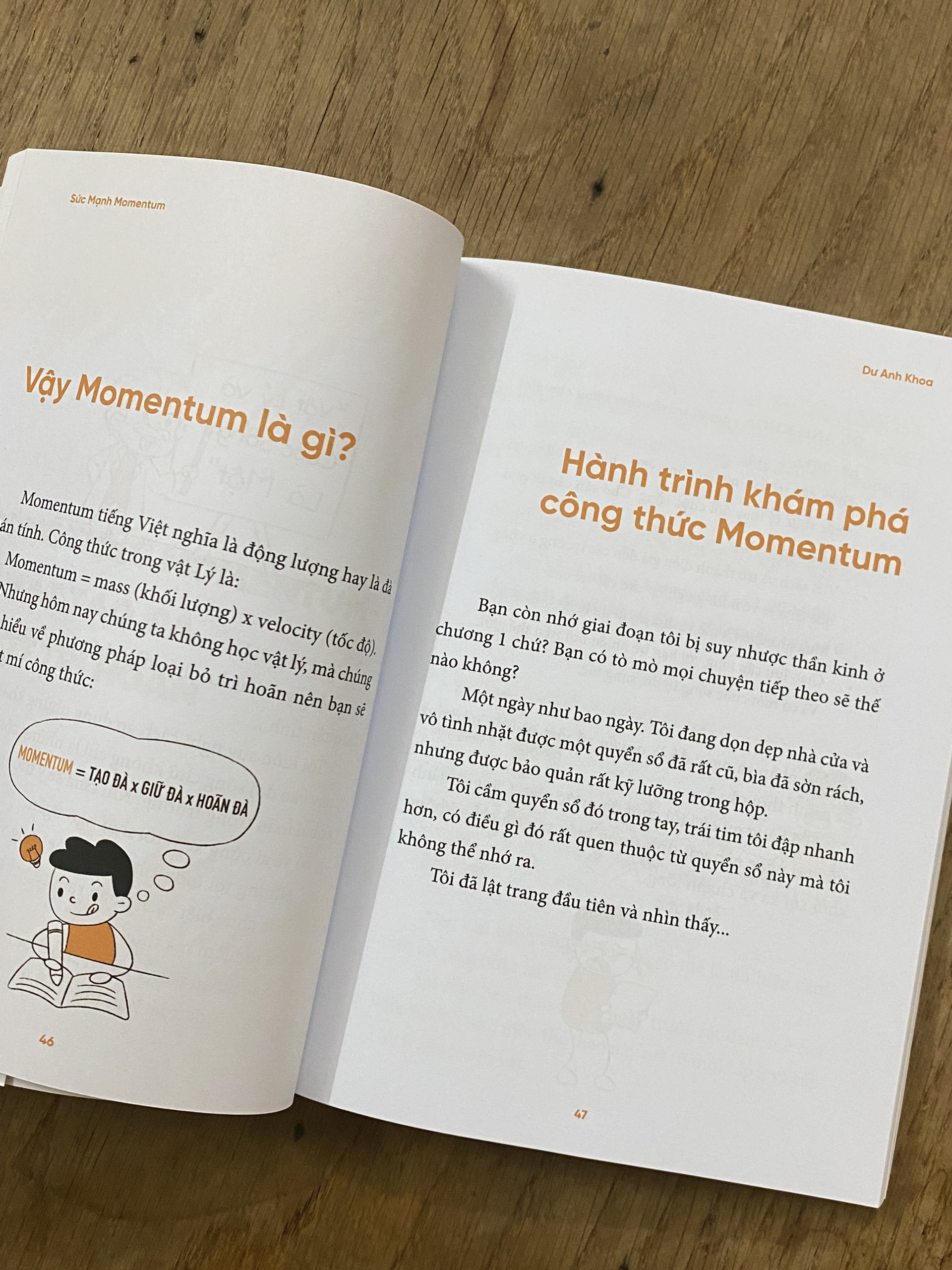 Theo định nghĩa của từ điển Cambridge, Momentum là The force that keeps an object moving (lực giúp cho mọi vật chuyển động). Con người chúng ta cũng vậy, mọi thứ đều khó khăn khi bắt đầu, nhưng khi đã có momentum, mọi thứ sẽ trở nên dễ dàng. Khai thác điều này như thế nào để đánh bay mọi trì hoãn - một "căn bệnh" phổ biến ở nhiều bạn trẻ - thì qua 220 trang sách, cùng với mã QRCode quà tặng, chúng ta sẽ nắm được bí mật của các bí quyết làm nên sức mạnh momentum.