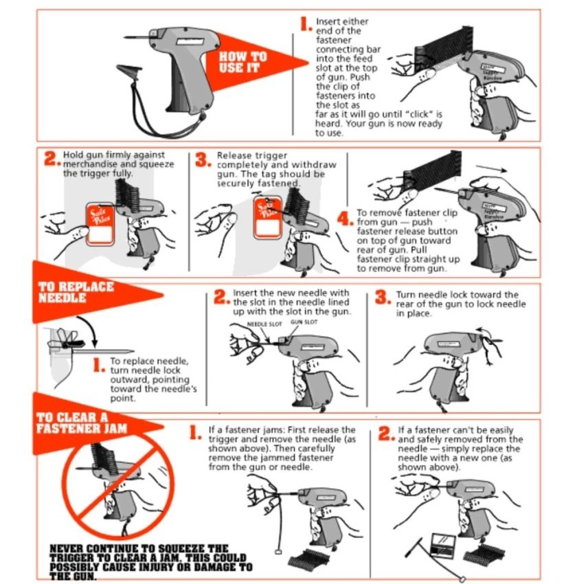 Súng gắn nhãn mác quần áo Chức năng: Đưa gọng nhựa nối quần áo hoặc mũ nóới 1 nhãn mác Hướng dẫn sử dụng Tiếng Anh Đối tượng sử dụng: Shop thời trang, xí