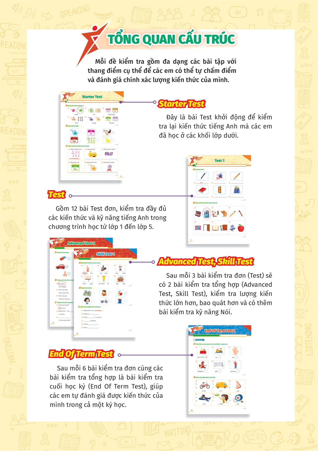 - Đa dạng và Toàn diện Bộ sách cung cấp các bài kiểm tra từ cơ bản đến nâng cao, bao gồm nhiều loại bài kiểm tra khác nhau, bao gồm kiểm tra từ vựng, kỹ năng nghe, đọc, viết và nói. Điều này giúp học sinh phát triển toàn diện các kỹ năng Tiếng Anh của họ và kiểm tra tất cả các khía cạnh của môn học. Cuốn sách gồm các bài kiểm tra được thiết kế như sau: