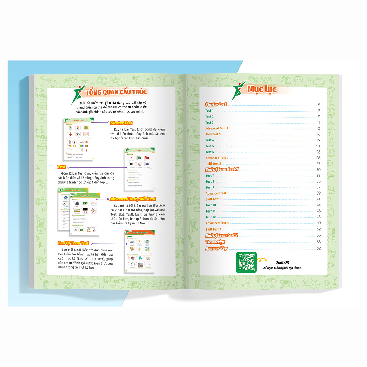 Bộ sách cung cấp các bài kiểm tra từ cơ bản đến nâng cao, bao gồm nhiều loại bài kiểm tra khác nhau, bao gồm kiểm tra từ vựng, kỹ năng nghe, đọc, viết và nói. Điều này giúp học sinh phát triển toàn diện các kỹ năng Tiếng Anh của họ và kiểm tra tất cả các khía cạnh của môn học.