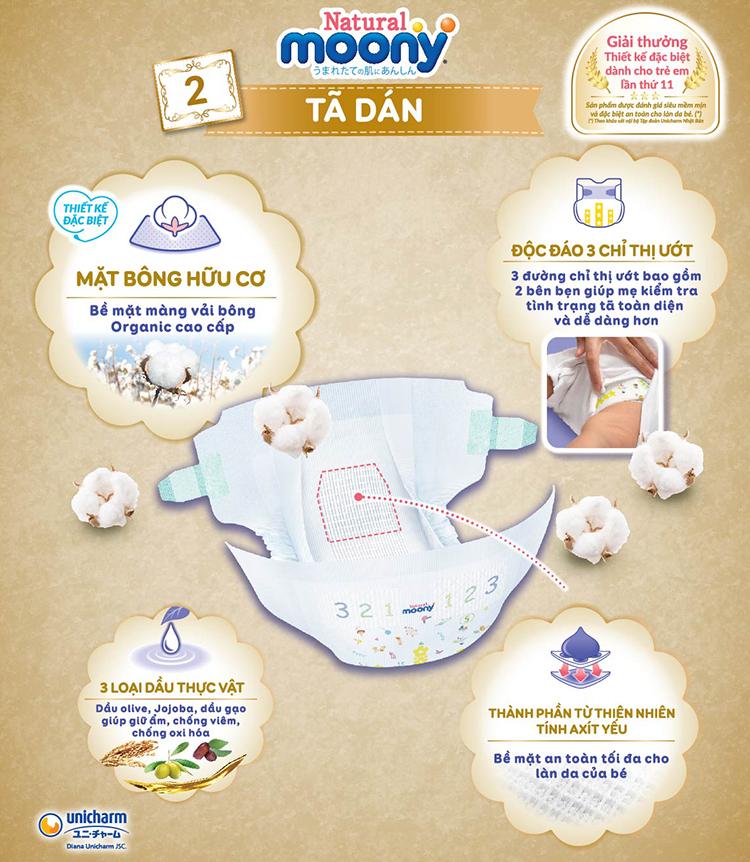 Moony Natural là tã dán cao cấp nhập khẩu từ Nhật Bản, được thiết kế riêng theo dáng bé với form C-sharp độc quyền. Đây là sản phẩm đầu tiên tại Nhật có bề mặt chứa bông organic, cực kỳ dịu nhẹ cho làn da nhạy cảm. Nhờ chất lượng vượt trội, Moony Natural được Hiệp hội các bà mẹ Nhật Bản tin chọn là dòng tã em bé số 1 hiện nay.