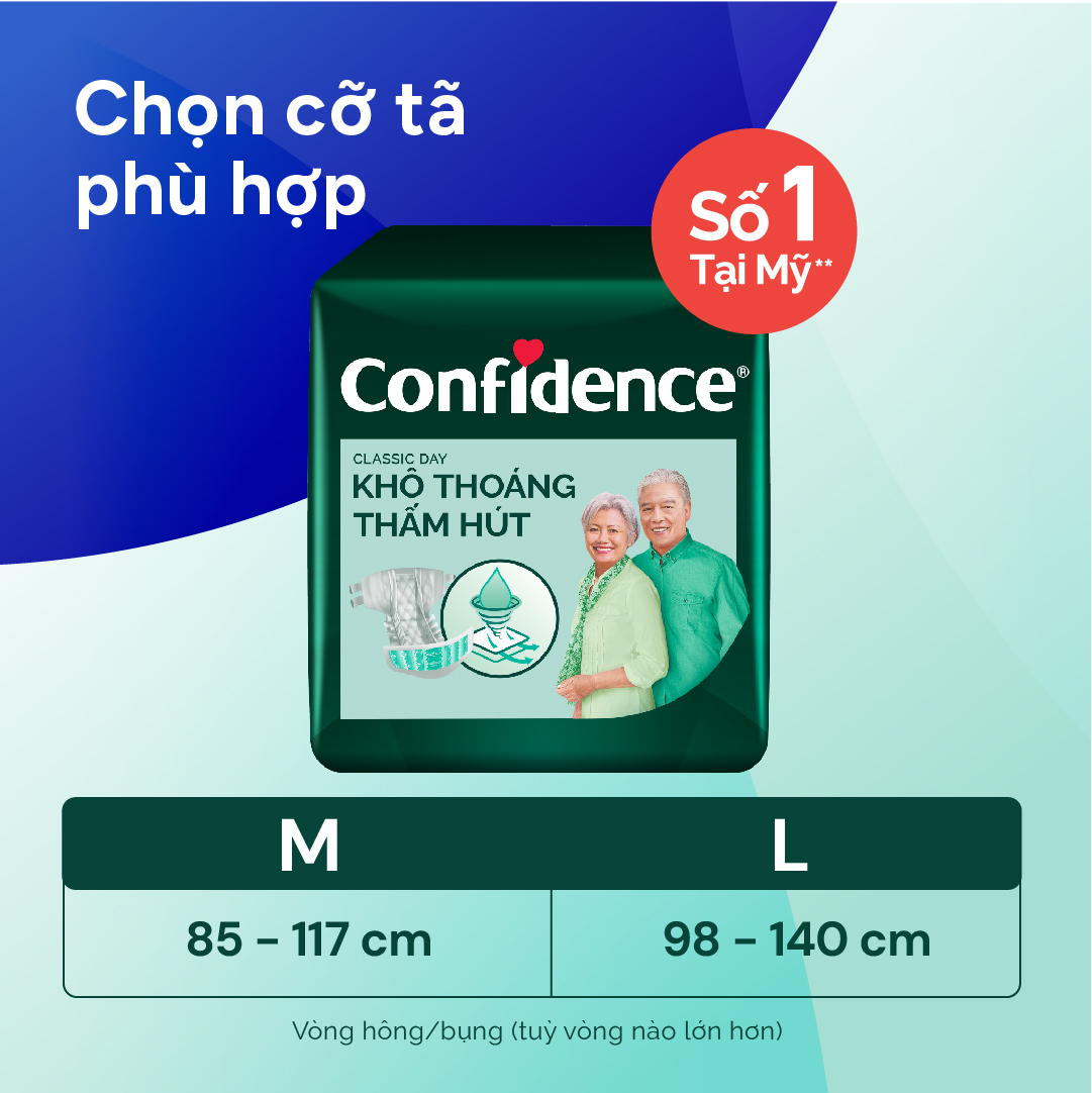 TÃ DÁN CONFIDENCE CLASSIC DAY - SIÊU THOÁNG KHÍ, SIÊU THẤM HÚT - AN TÂM & THOẢI MÁI cho cả gia đình. Sản phẩm tăng cường độ thấm hút và giữ bề mặt tã luôn khô thoáng, là lựa chọn hiệu quả cho người dùng hạn chế khả năng đi lại. ĐẶC ĐIỂM NỔI BẬT