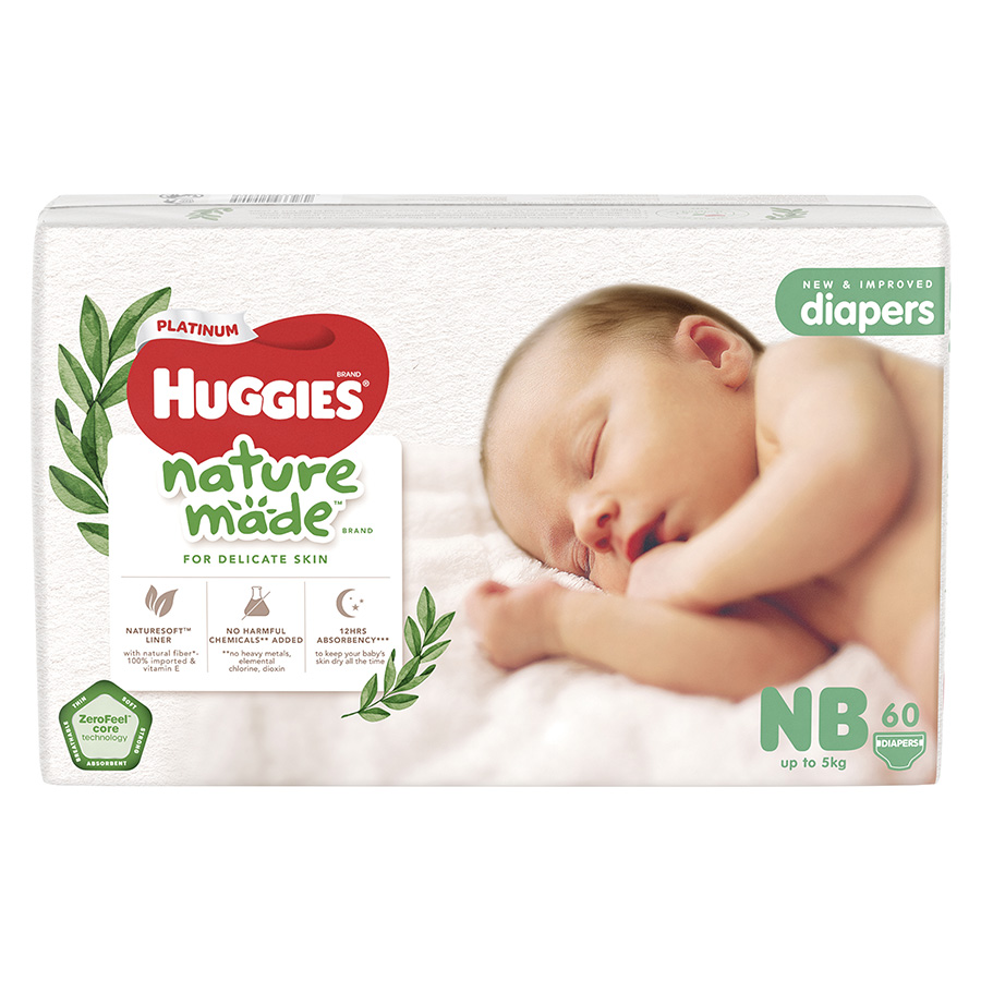 - Tã dán cao cấp Huggies Platinum Nature Made size NB (dưới 5kg): 60 miếng/túi