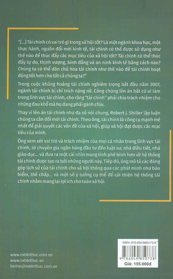 Robert J. Shiller (sinh năm 1946), Giáo sư Kinh tế tại Đại học Yale. Ông tốt nghiệp Đại học Michigan năm 1967, nhận bằng Tiến sĩ Kinh tế tại Học viện Công nghệ Massachusetts năm 1972. Ông đoạt Giải Nobel Kinh tế năm 2013 cùng với Eugene Fama và Lars Peter Hansen. Robert J. Shiller là tác giả của nhiều đầu sách nổi tiếng viết về thị trường tài chính, đổi mới tài chính, kinh tế học hành vi, kinh tế vĩ mô, bất động sản, phương pháp thống kê, về thái độ, quan điểm và đánh giá đạo đức của công chúng với thị trường. Một số tác phẩm nổi bật: -Market Volatility (Biến động thị trường) - 1989 -Macro Markets (Thị trường vĩ mô) - 1993 -The New Financial Order: Risk in the 21st (Trật tự tài chính mới: Rủi ro trong thế kỉ 21) - 2003 -Irrational Exiberance (Hưng phấn bất hợp lí) - 2000 -The Subprime Solution (Giải pháp cho vay dưới chuẩn - 2008 -Animal Spirits (Tâm lí bầy đàn - 2009 (Cùng với George A.Akerlof). 2) Tác phẩm Tài chính và xã hội tốt, cuốn sách dành cho hàng nghìn sinh viên ở khắp nơi trên thế giới đang chuẩn bị theo học các khóa học về chuyên ngành kinh tế và tài chính tại các trường đại học, hàng vạn thanh niên sắp bắt đầu các công việc có liên quan, ở một khía cạnh nào đó, đến hoạt động tài chính. Dù thế hệ sinh viên và chuyên gia trẻ trong các lớp học, các tập đoàn, tổ chức phi lợi nhuận, cơ quan quản lí hiện nay không có gì đặc biệt nhưng những năm gần đây có điều gì đó rất mới về nét văn hóa mà họ sẽ học được. Nghĩa là vai trò của các công nghệ tài chính mới trong việc gây ra cuộc khủng hoảng tài chính hiện tại đã trở thành vấn đề thu hút sự quan tâm của tất cả mọi người, đồng thời cũng là vấn đề cần được nghiên cứu chuyên sâu. Cuốn sách gồm hai phần chính và một phần giới thiệu. Phần giới thiệu đưa ra bối cảnh của chủ nghĩa tư bản tài chính trong lịch sử hiện đại và xã hội toàn cầu, nhấn mạnh đến tính trung tâm của các đổi mới tài chính, từ thị trường chứng khoán đến thị trường thế chấp, trong việc góp phần đạt được tất cả các mục tiêu lâu dài khác nhau của con người và vai trò “quản lí” tài sản xã hội của ngành tài chính. Phần 1, “Vai trò và Trách nhiệm”, tiếp tục xây dựng vai trò của các chuyên gia tài chính - gồm các chuyên gia ngân hàng, kế toán viên, luật sư, chuyên gia đầu tư ngân hàng, nhà điều tiết và nhiều người khác - khi thực hiện vai trò của mình trong xã hội tốt. Phần 2, “Tài chính và những bất mãn”, được viết từ một góc nhìn khác, đưa ra một loạt câu hỏi về đạo đức và bản chất của tài chính trong một xã hội đang phát triển.
