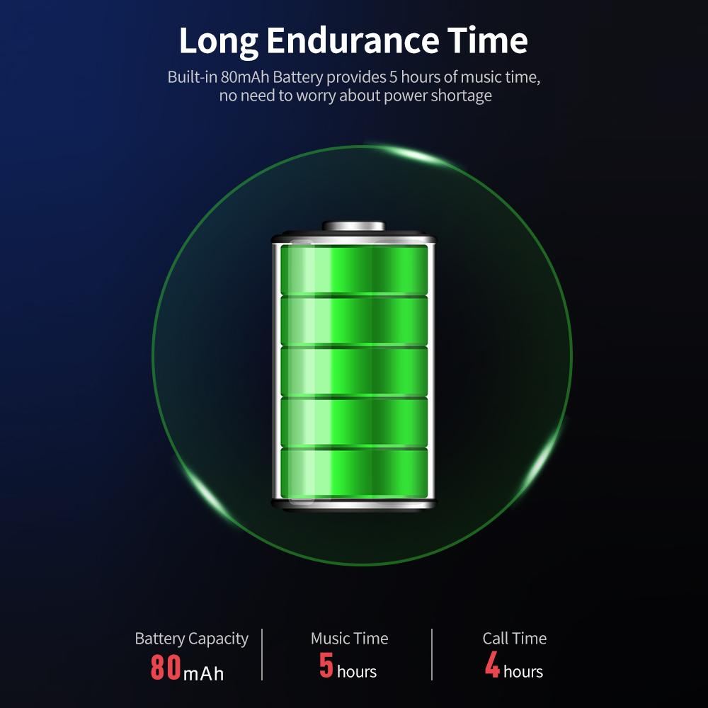 Built-in 80mAh rechargeable lithium battery provides 5 hours of music time, no need to worry about power shortage.