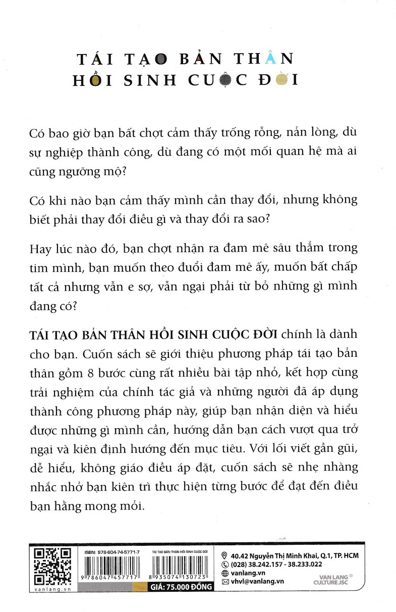 TÁI TẠO BẢN THÂN HỒI SINH CUỘC ĐỜI chính là dành cho bạn. Cuốn sách sẽ giới thiệu phương pháp tái tạo bản thân gồm 8 bước cùng rất nhiều bài tập nhỏ, kết hợp cùng trải nghiệm của chính tác giả và những người đã áp dụng thành công phương pháp này, giúp bạn nhận diện và hiểu được những gì mình cần, hướng dẫn bạn cách vượt qua trở ngại và kiên định hướng đến mục tiêu. Với lối viết gần gũi, dễ hiểu, không giáo điều áp đặt, cuốn sách sẽ nhẹ nhàng nhắc nhở bạn kiên trì thực hiện từng bước để đạt đến điều bạn hằng mong mỏi.