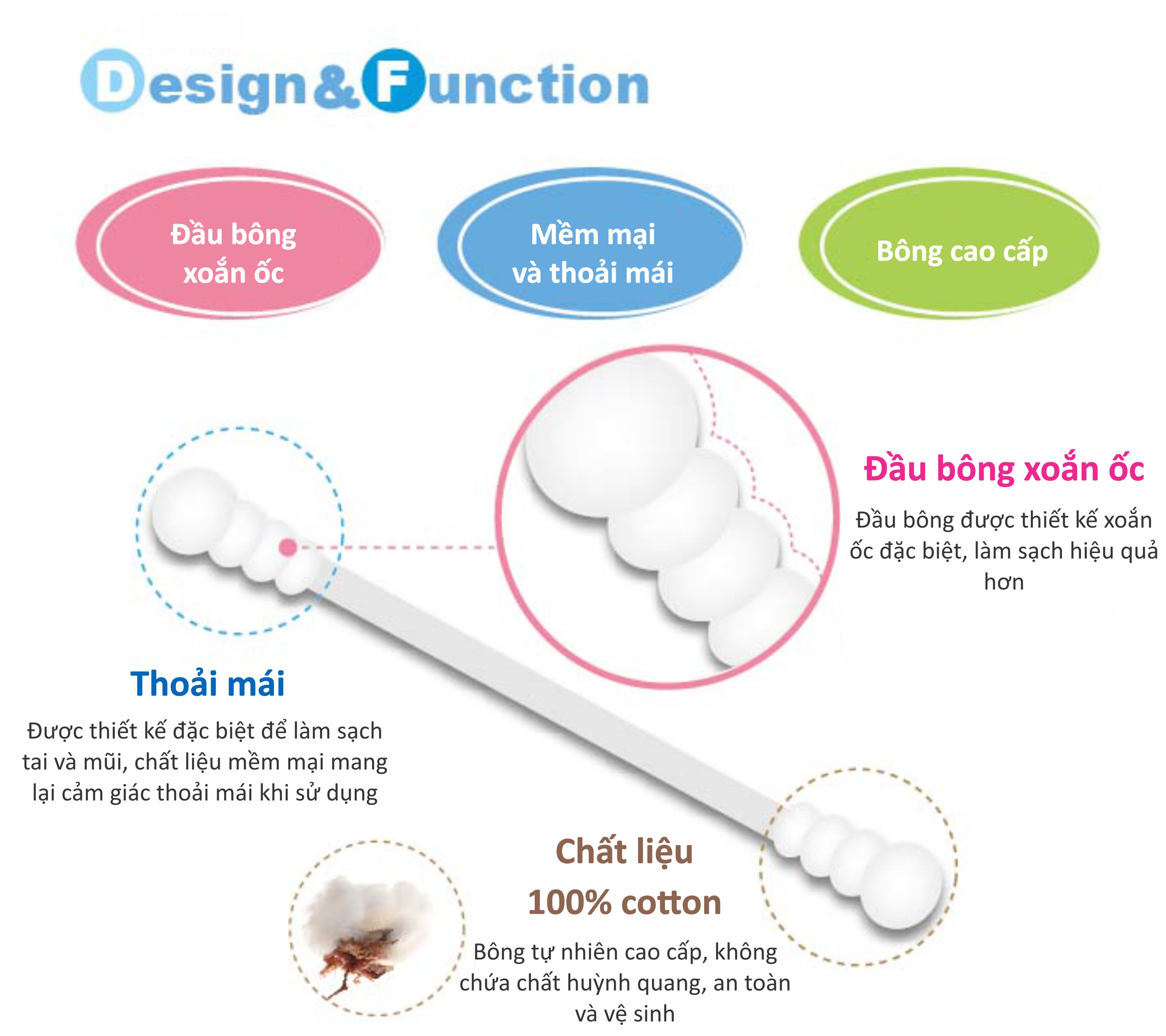 Đầu tăm được làm từ 100% bông chất lượng cao được sản xuất với công nghệ hiện đại, cho cảm giác mềm mại, không gây khô ráp khi chạm vào da hay vùng nhạy cảm của