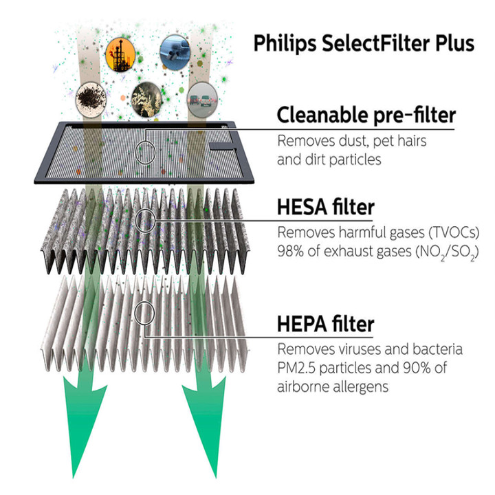 - Khả năng lọc hạt hiệu suất cao của Philips loại bỏ các hạt bụi siêu nhỏ bên trong xe hơi, bao gồm khói thuốc lá, phấn hoa, bụi, hạt cỡ PM2.5, các vi khuẩn và vi rút lan truyền trong không khí nhỏ cỡ 0.3 micrômet, với Tỷ lệ không khí sạch nhận được (CADR) là 30m3/giờ (99.9% khả năng lọc các hạt nhỏ hơn 0.3µm; khoảng 3m3)