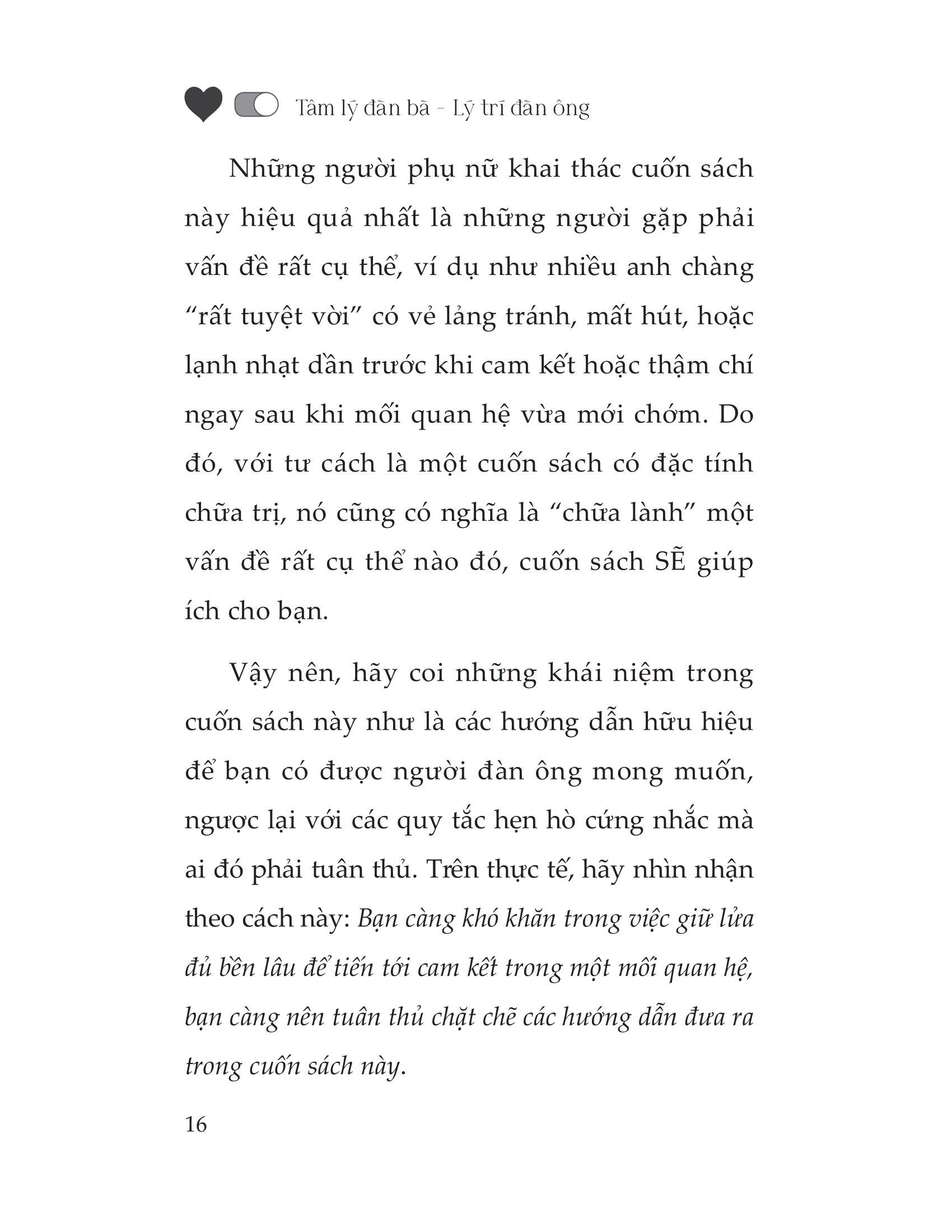 Tâm lý đàn bà – lý trí đàn ông là một cuốn sách về chủ đề hẹn hò sẽ tiết lộ các thói quen, tín ngưỡng, thái độ hẹn hò của những người phụ nữ “đắt giá”; những người phụ nữ này luôn luôn trung thành với các tiêu chuẩn hẹn hò và cố thủ các ranh giới cá nhân của riêng họ, bất chấp người đàn ông mà cô ấy đang hẹn hò đáng mơ ước, đáng khao khát, thân thế bất phàm ra sao. Vì thế nếu bạn sẵn sàng “giăng câu” anh chàng Mr Right (Người đàn ông chân chính) của m.ình ngay từ vài tuần hẹn hò đầu tiên, làm sao để anh ấy phải khao khát ở bên bạn, mong mỏi được đồng hành với bạn và nài nỉ sự cam kết của bạn, hãy đọc cuốn sách này. Cuốn sách gồm 4 chương với những nội dung chính thú vị như: