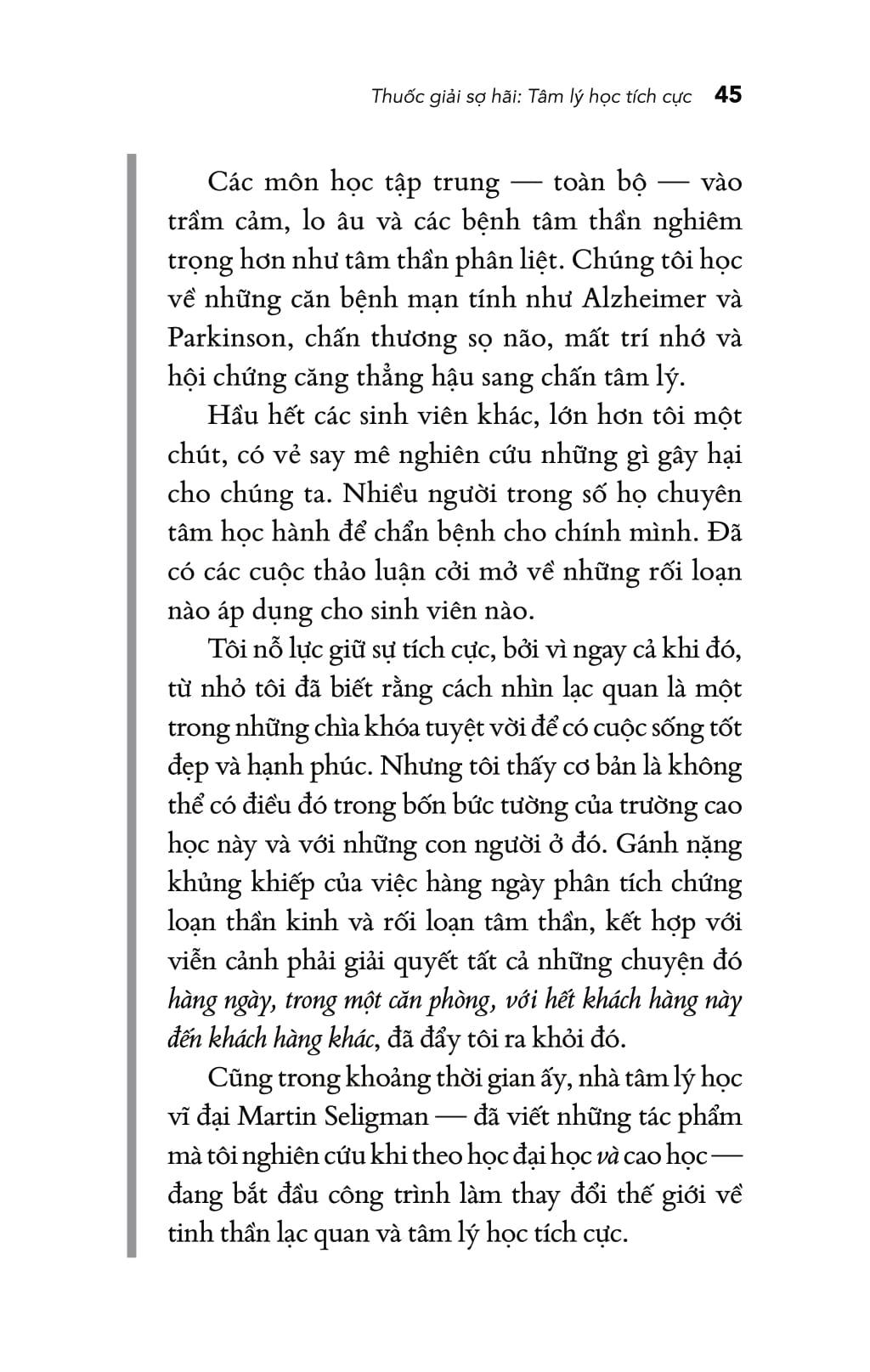 Bạn sẽ học được đúng cách vượt qua nỗi sợ hãi — sát thủ “diệt” doanh số — và thay bằng sự tự tin, lạc quan, lòng biết ơn, niềm vui và chủ động trong công việc bán hàng. Đây là cuốn sách đầu tiên vận dụng tâm lý học tích cực để biến đổi cách chúng ta làm việc giúp bạn bán được nhiều hơn.