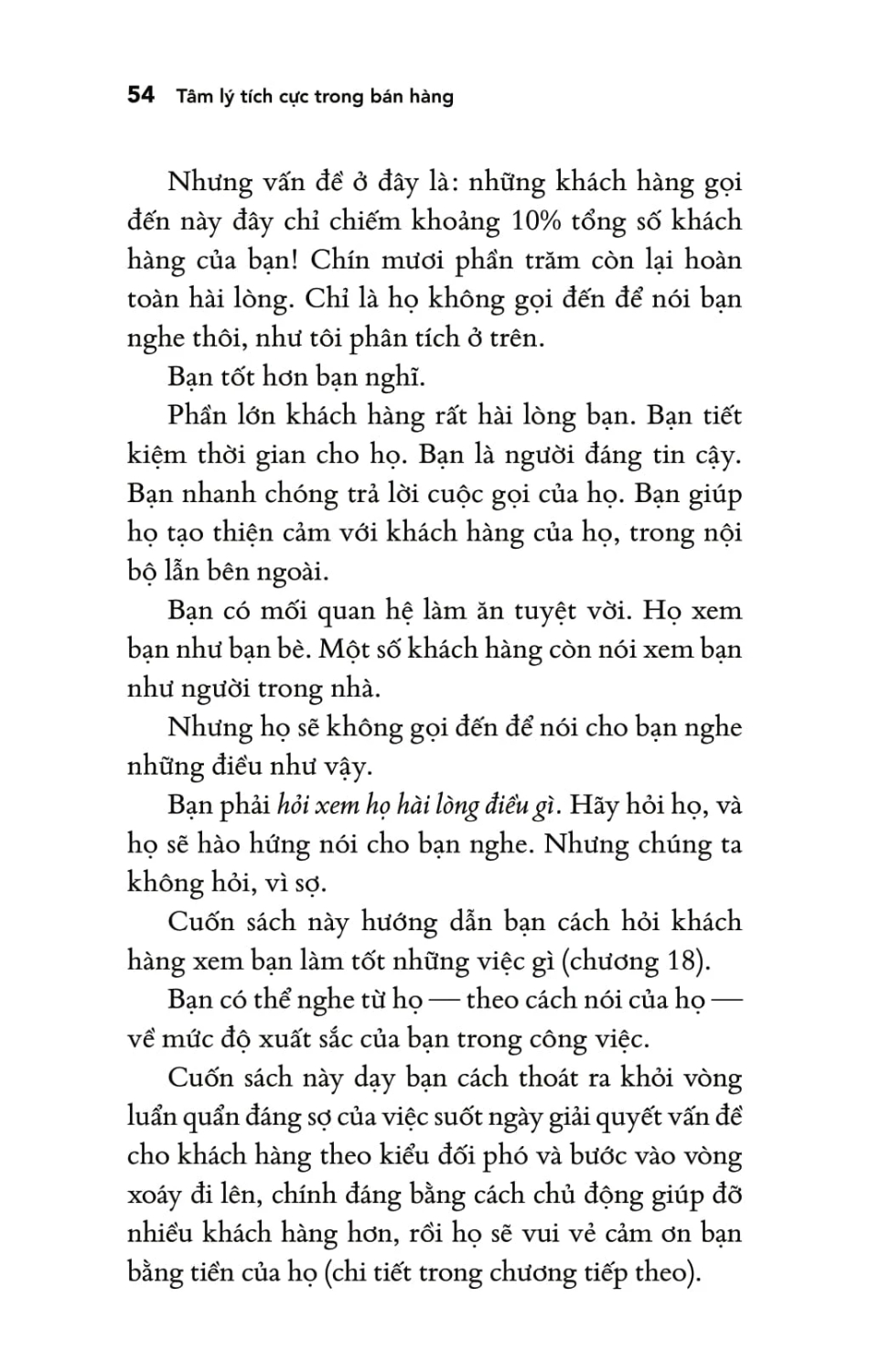 Bạn sẽ học được đúng cách vượt qua nỗi sợ hãi — sát thủ “diệt” doanh số — và thay bằng sự tự tin, lạc quan, lòng biết ơn, niềm vui và chủ động trong công việc bán hàng. Đây là cuốn sách đầu tiên vận dụng tâm lý học tích cực để biến đổi cách chúng ta làm việc giúp bạn bán được nhiều hơn.