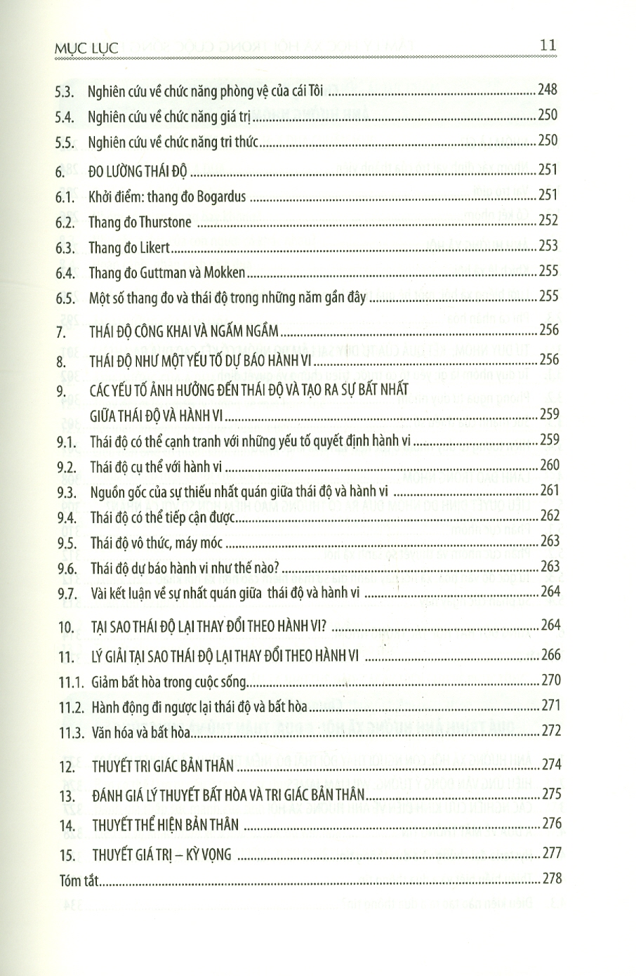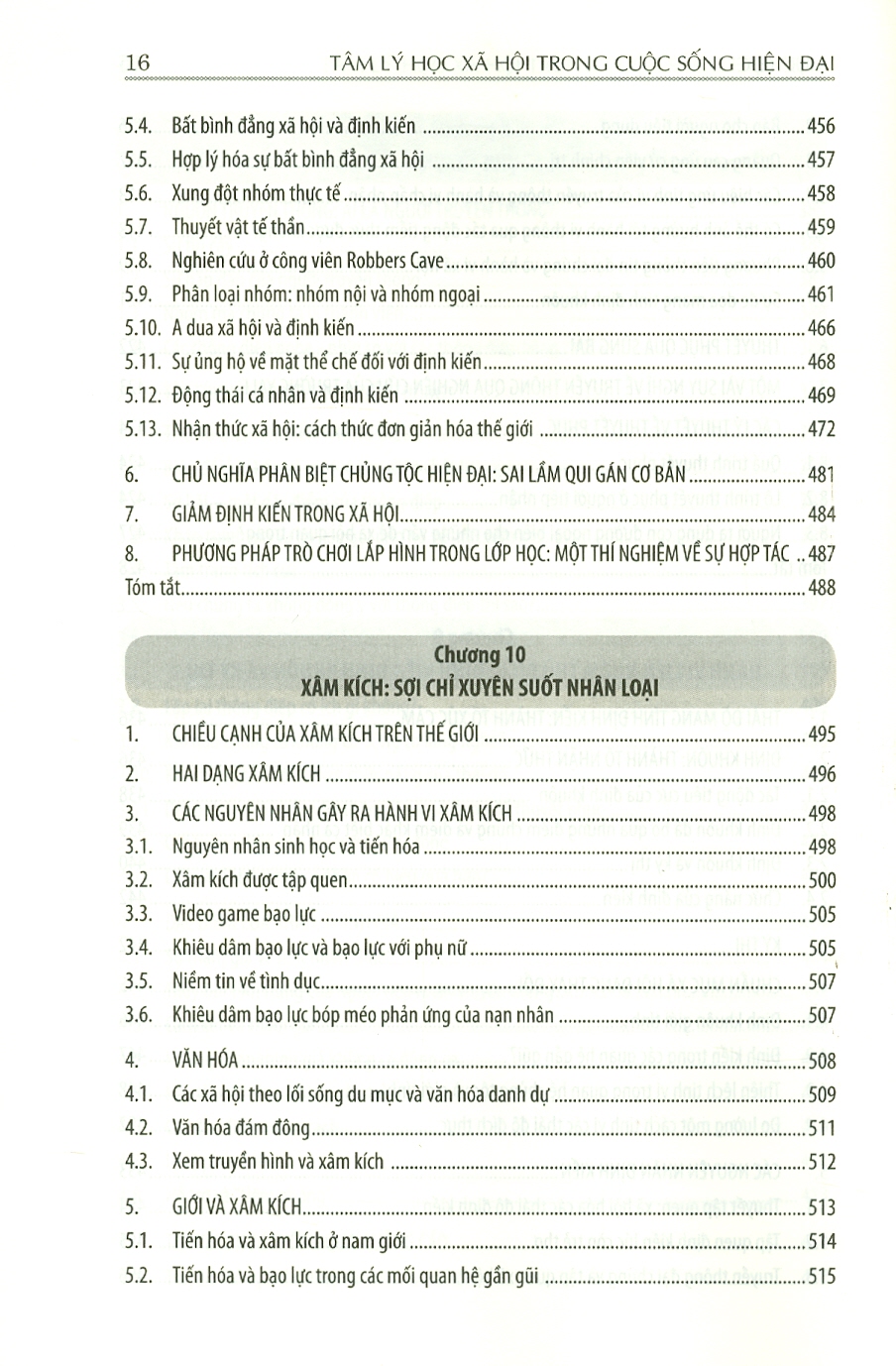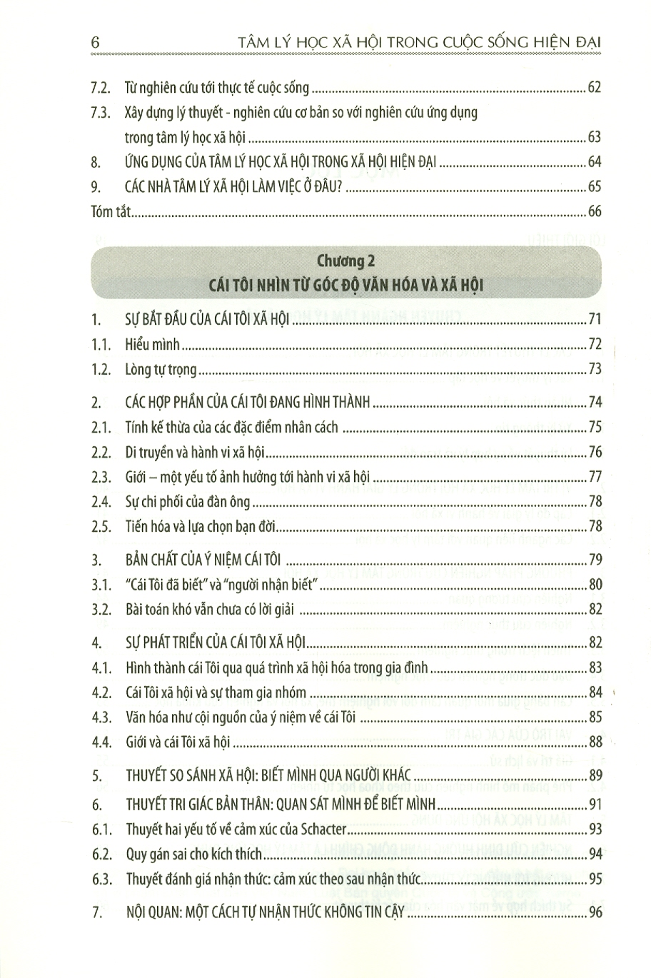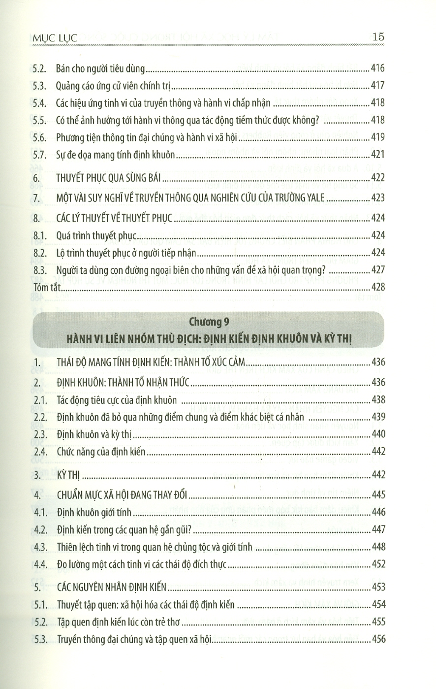Chương 1: chuyên ngành tâm lý học xã hội Chương 2: Cái tôi nhìn từ góc độ văn hóa và xã hội Chương 3: Sự hấp dẫn và các mối quan hệ: từ gắn bó đầu đợi đến tình yêu lưá đôi Chương 4: Nhận thức xã hội: Chúng ta nghĩ về cuộc sống xã hội như thế nào Chương 5: Thái độ và hành vi Chương 6: Ảnh hưởng nhóm Chương 7: Quá trình ảnh hưởng xã hội: A dua, tuân thủ và phục tùng Chương 8: Thuyêt phục Chương 9: Hành vi liên nhóm thù địch: Định kiến, định khuôn và thù địch Chương 10: Xâm kích: sợ chỉ xuyên suốt nhân loại Chương 11: Vị tha và hành vi ủng hộ xã hội