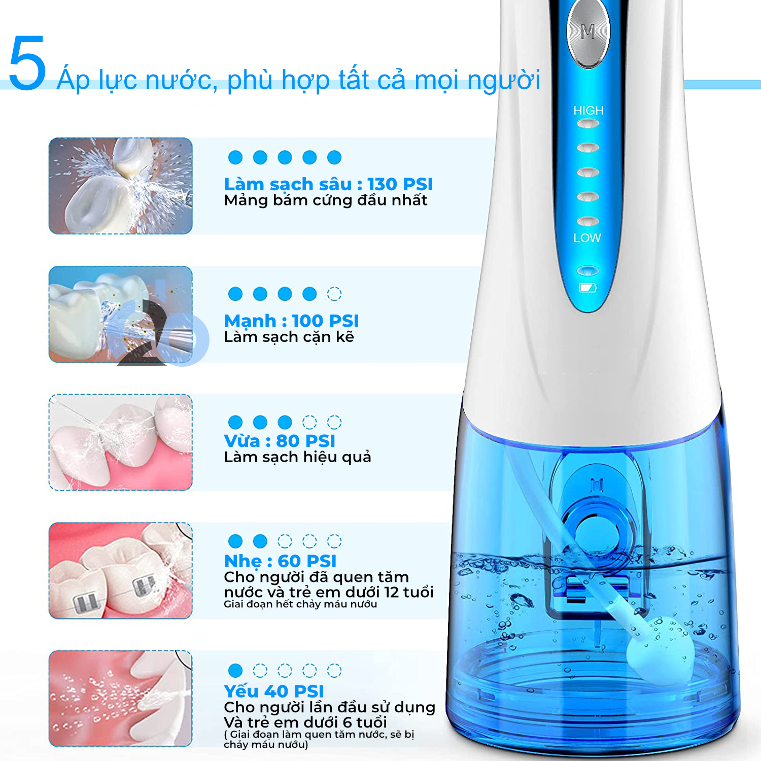 - Áp lực nước 20-130 PSI. Thông Số Kỹ Thuật h2ofloss hf6 -Bình nước 300 ml, thời gian sử dụng 45 giây. -Pin 2150 mAh sạc nhanh 4 tiếng sử dụng lên tới 4 tuần. Thời gian sử dụng thực tế có thể thay đổi tuỳ vào tình trạng pin, nhiệt độ, độ ẩm và môi trường -Đèn LED báo tình trạng pin, đèn đỏ báo hết pin, đèn xanh chớp đang sạc, đèn xanh báo đầy pin -Dây sạc USB có thể dùng chung với các đầu sạc thông dụng, bin dự phòng , máy tính. -Áp lực nước : 10- 130 PSI với 5 chế độ phù hợp với tất cả mọi người -Tặng kèm 5 đầu tăm, hộp đựng đầu tăm và túi đựng máy và củ sạc nguồn thấp chuyên dụng cho máy tăm nước.