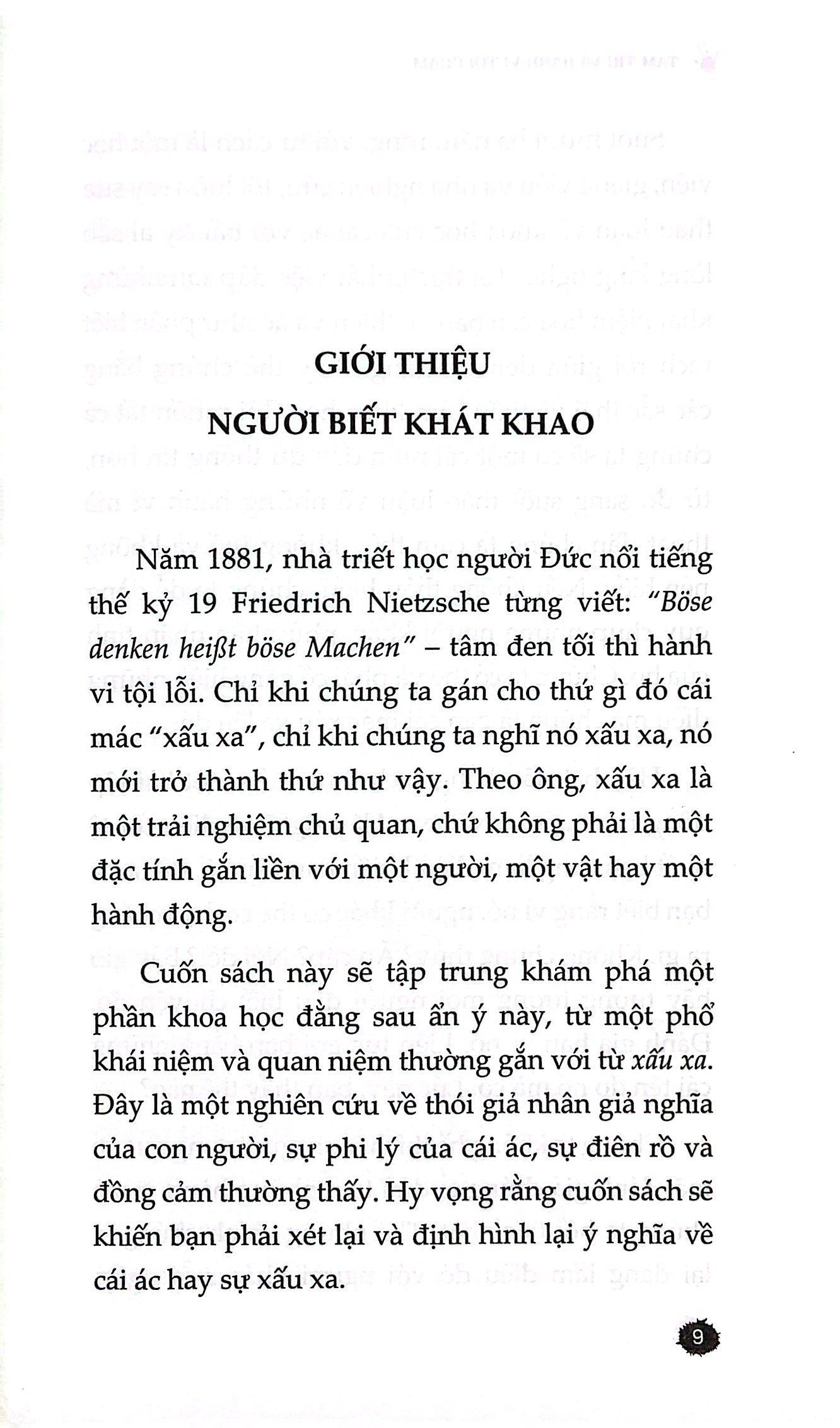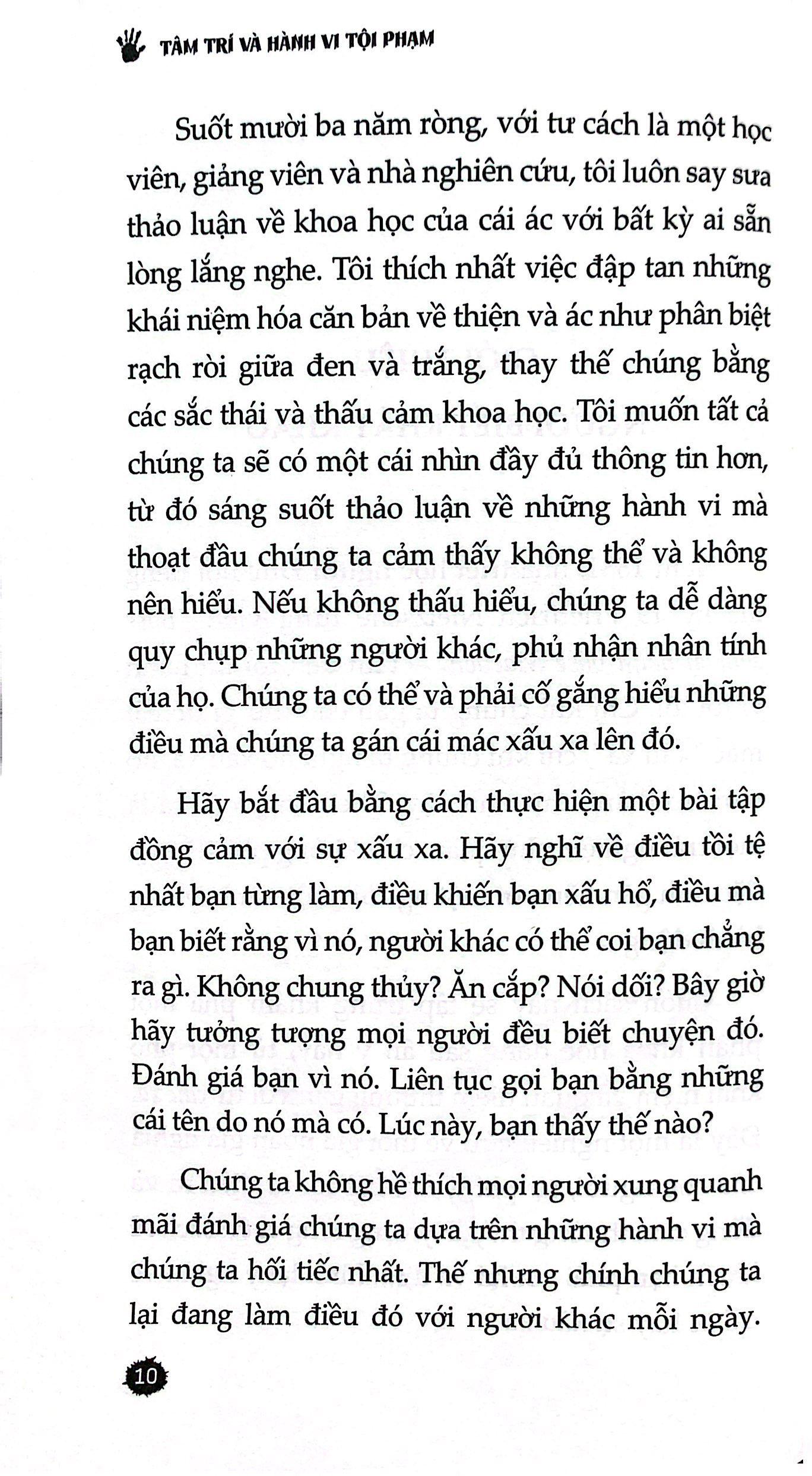 Theo nhà triết học người Đức nổi tiếng thế kỷ 19, Friedrich Nietzsche, xấu xa là một trải nghiệm chủ quan, chứ không phải là một đặc tính gắn liền với một người, một vật hay một hành động. Cuốn sách “Tâm trí và hành vi tội phạm” sẽ tập trung khám phá một phần khoa học đằng sau ẩn ý này, từ một phổ khái niệm và quan niệm thường gắn với từ xấu xa. Đây là một nghiên cứu về thói giả nhân giả nghĩa của con người, sự phi lý của cái ác, sự điên rồ và đồng cảm thường thấy. Cuốn sách sẽ khiến bạn phải xét lại và định hình lại ý nghĩa về cái ác hay sự xấu xa.